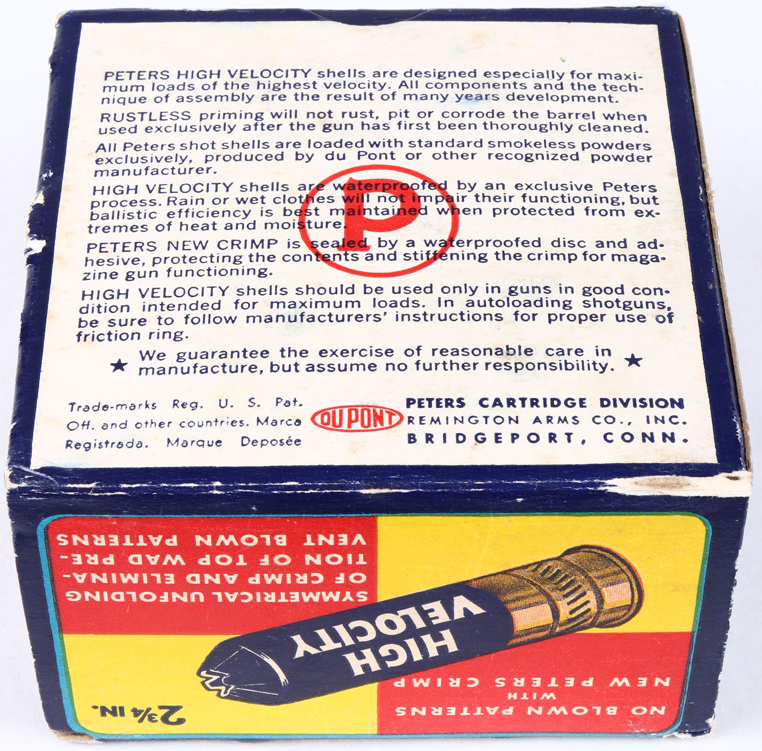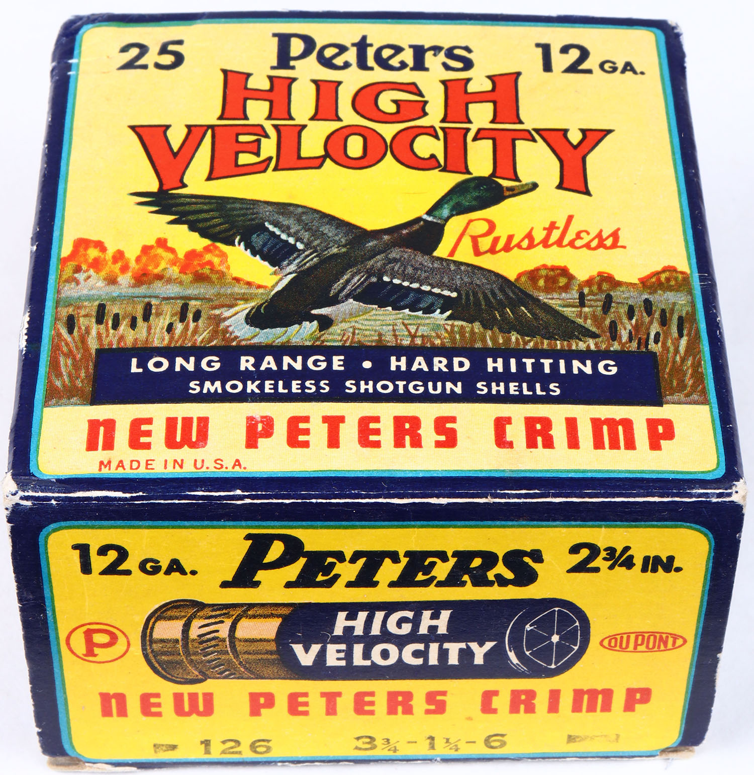 Peters Cart. Co., High Velocity, New Peters Crimp, 12ga., 1pc., Full, shot size 6, multi colored box that pictures Mallard flying out of the marsh grass, paper shells, box is very solid with slight edge wear, shells are good. Grade: Excellent - Value: 20 to 60