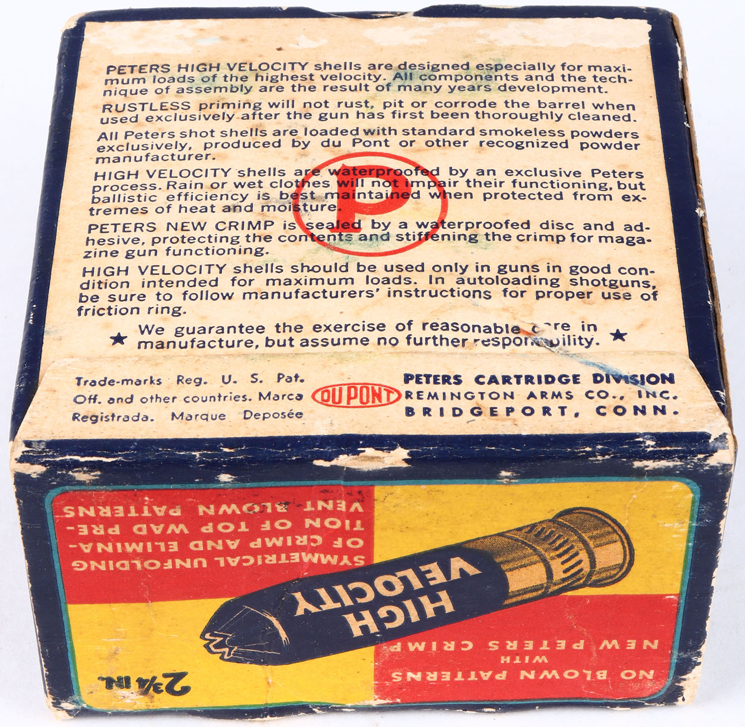 Peters Cart. Co., High Velocity, New Peters Crimp, 12ga., 1pc., Partial 19rds, shot size 6, multi colored box that pictures mallard flying out of the marsh grass, paper shells, box has light edge wear with light age soiling and nice colors, shells are very good. Grade: Very Good ++ - Value: 20 to 50