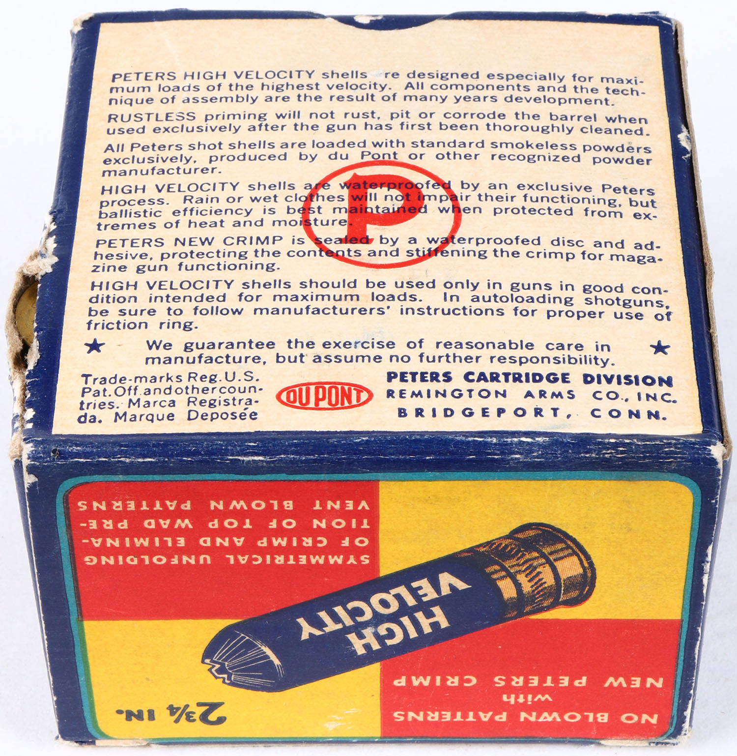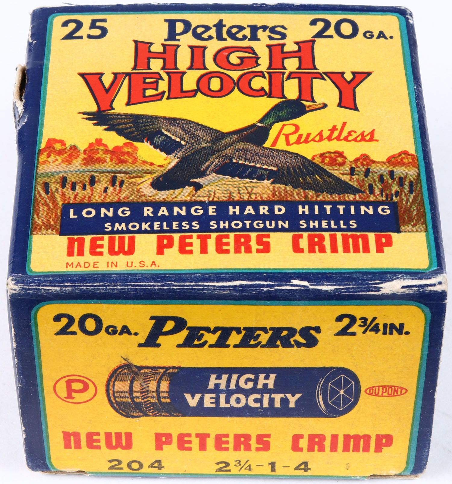 Peters Cart. Co., High Velocity, New Peters Crimp, 20ga., 1pc., Full, shot size 4, multi colored box that pictures mallard flying out of the marsh grass, paper shells, box has shell protrusions, shells are excellent. Grade: Excellent ++ - Value: 20 to 60