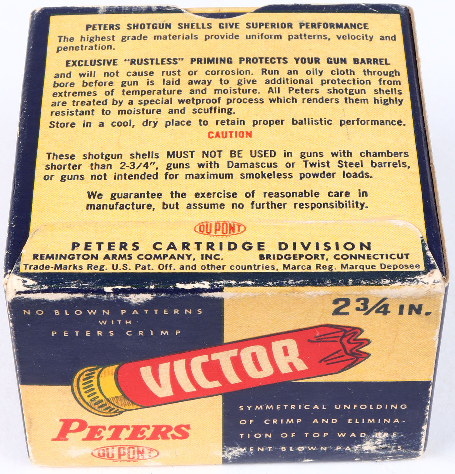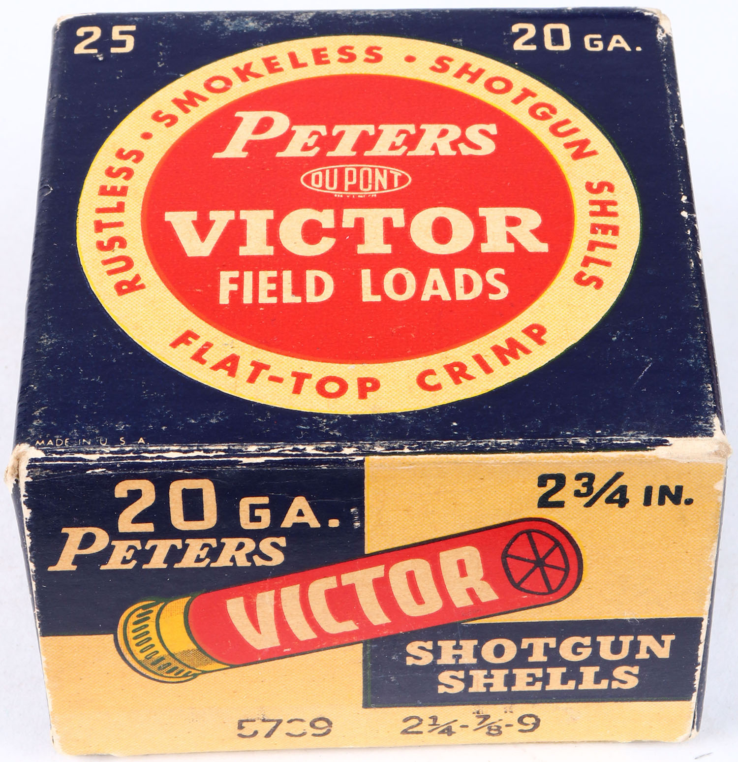 Peters, VICTOR FIELD LOADS, 20ga., 1pc., Empty, shot size 9, blue, white & red box, box is very solid with excellent color. Grade: Excellent + - Value: 10 to 40