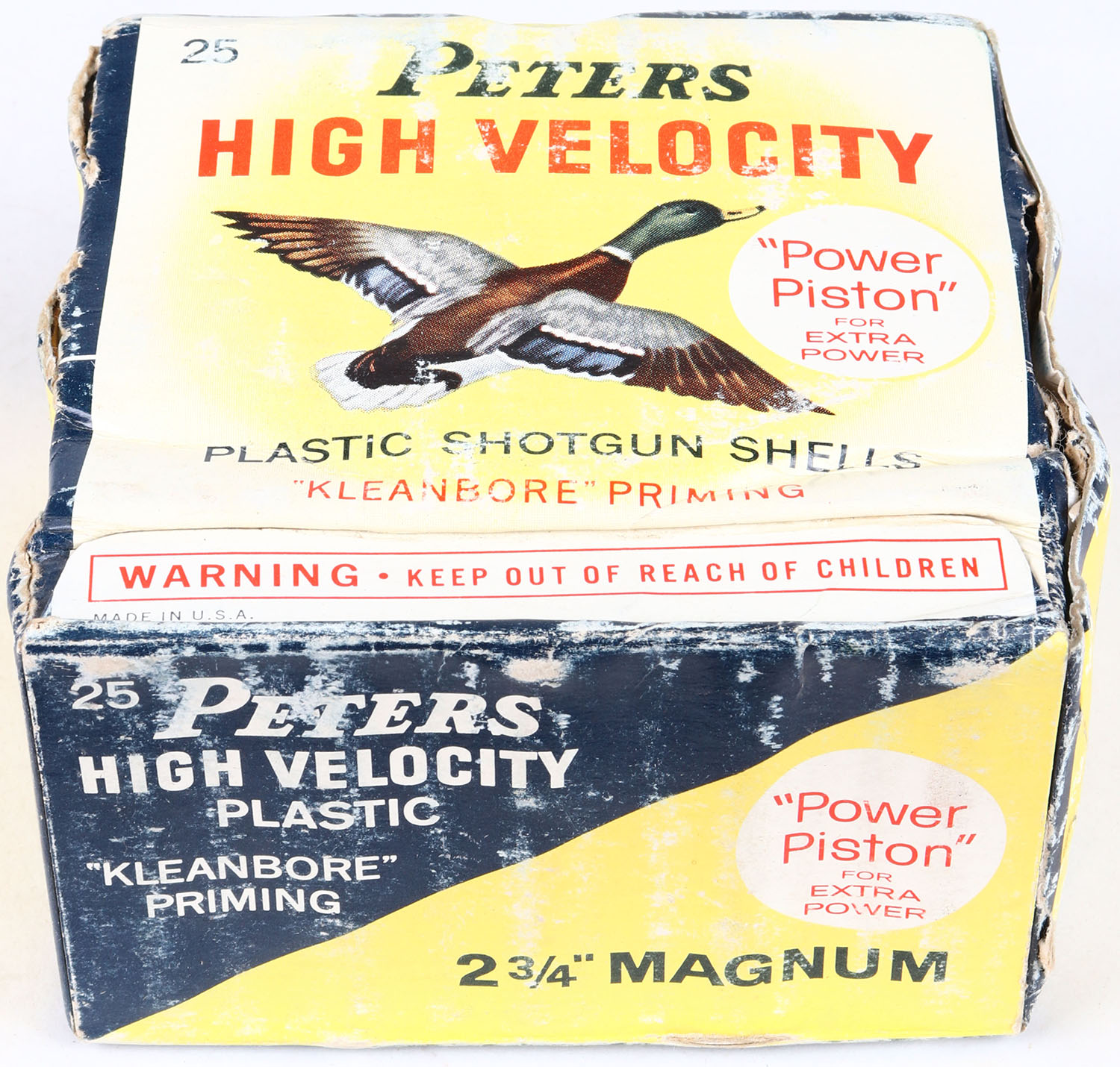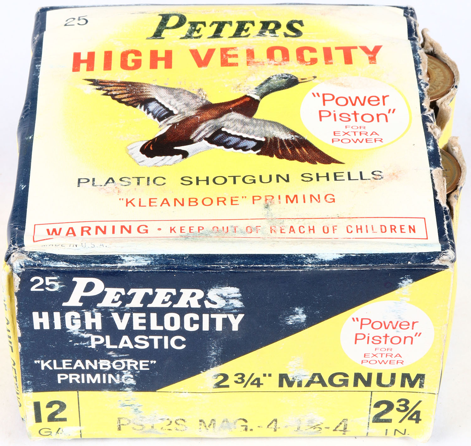 Peters Cart. Co., High Velocity, 12ga, 2 3/4'' Magnum, 1pc., Full, shot size 4, multi colored box that pictures mallard flying, box has lots of shell protrusions with very nice color, shells are very good. Grade: Very Good ++ - Value: 20 to 40
