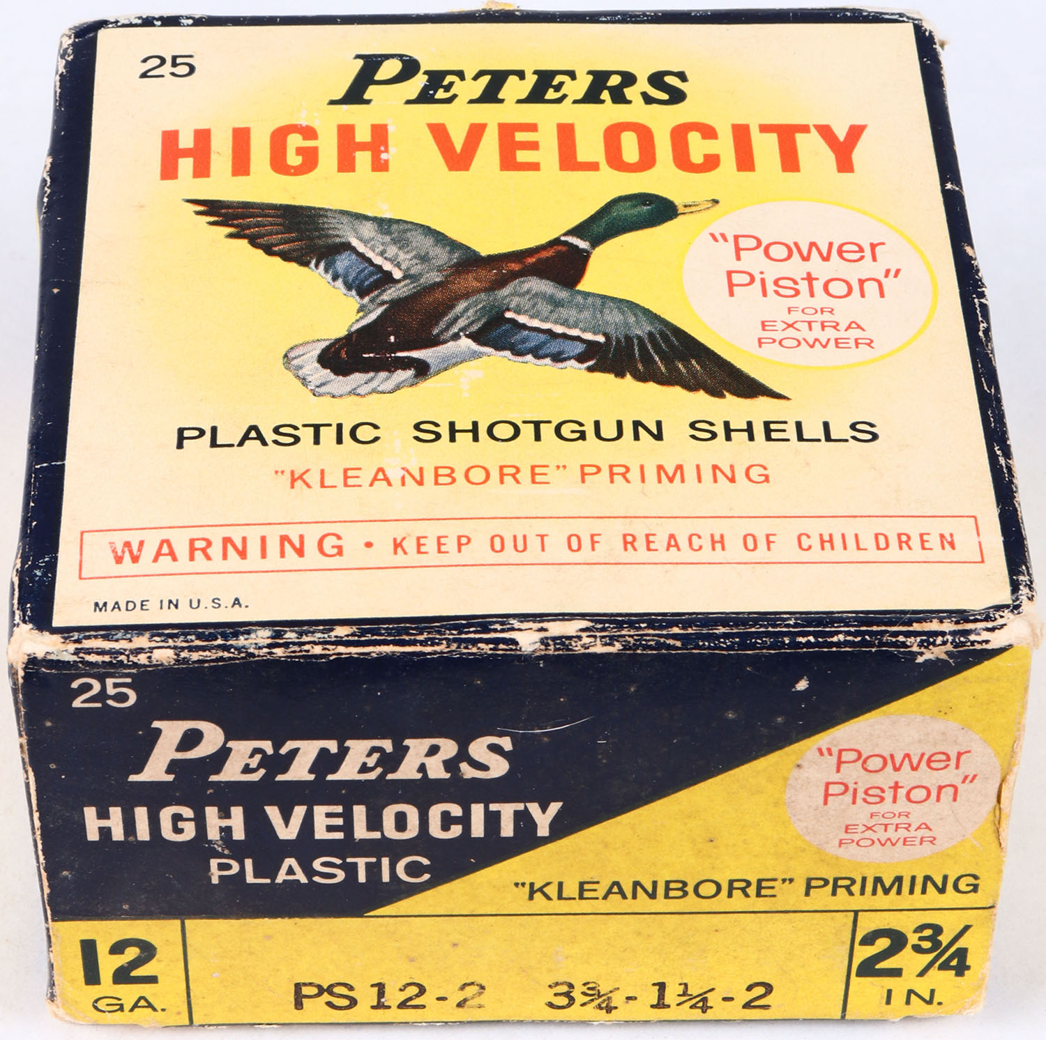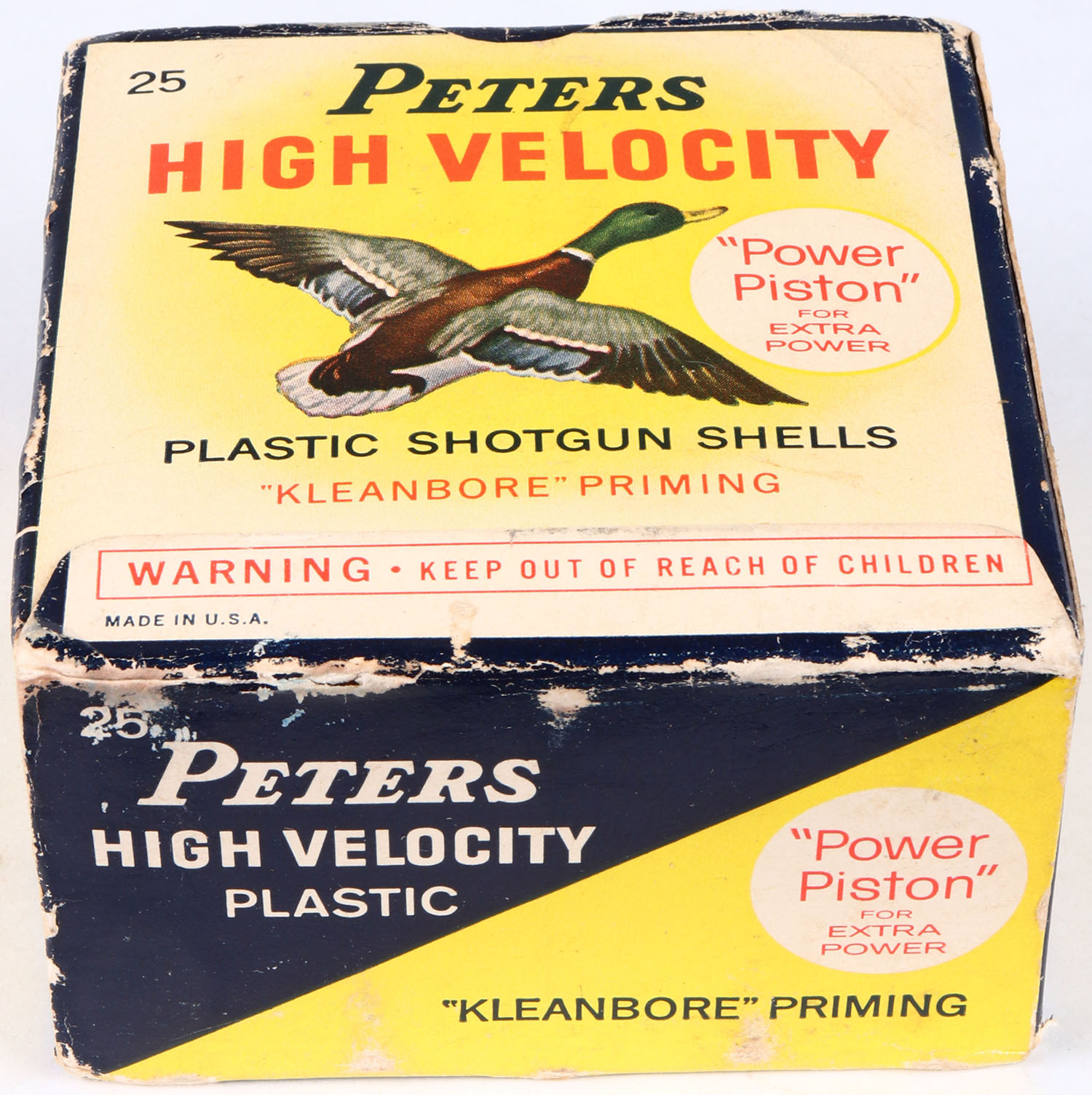 Peters Cart. Co., High Velocity, 12ga, 2 3/4'', 1pc., Full, shot size 2, multi colored box that pictures mallard flying, box is solid with edge wear and great color, shells are very good. Grade: Very Good ++ - Value: 10 to 30