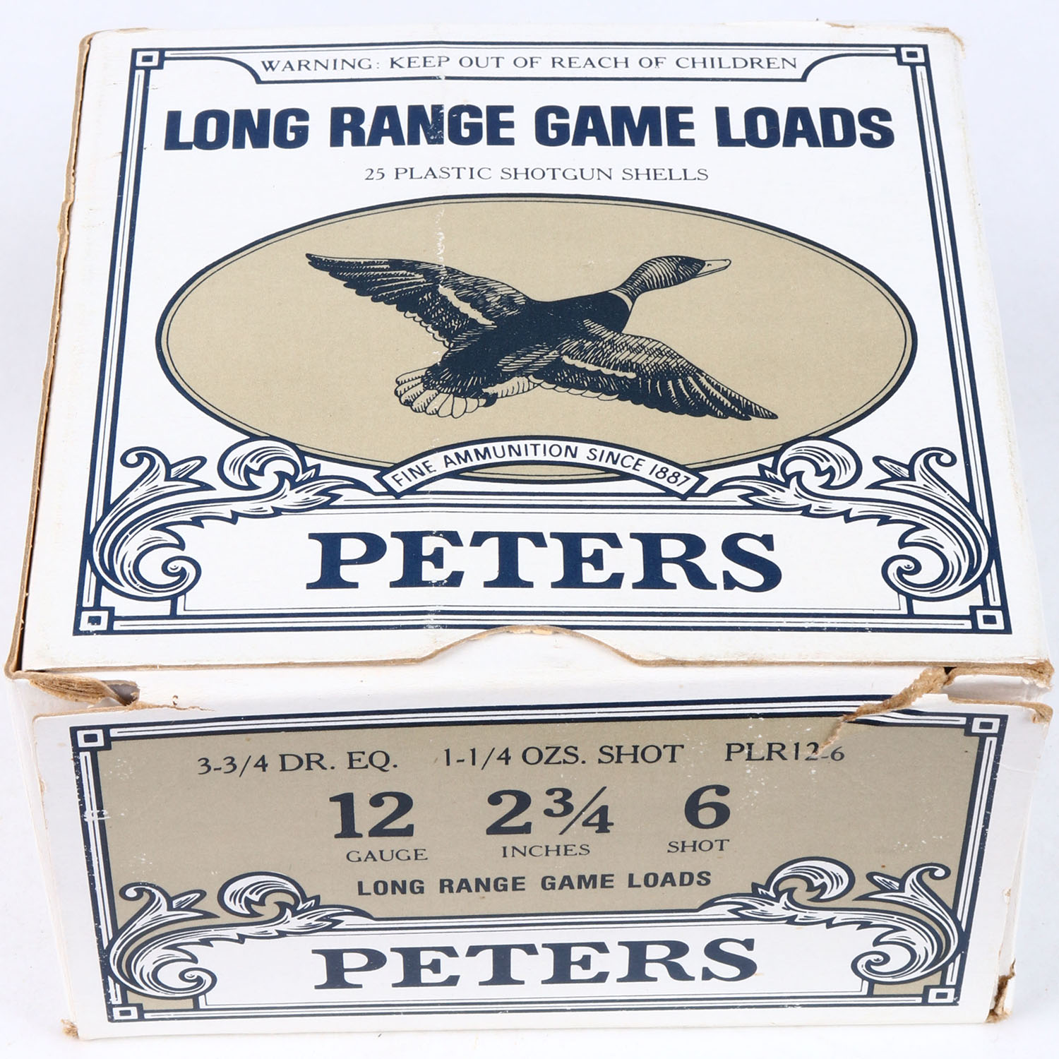 Peters, LONG RANGE GAME LOADS, 12ga., 1pc., Partial 24rds, shot size 6, solid box with excellent colors, shells are excellent. Grade: Excellent ++ - Value: 8 to 30