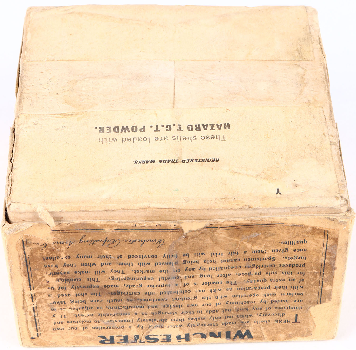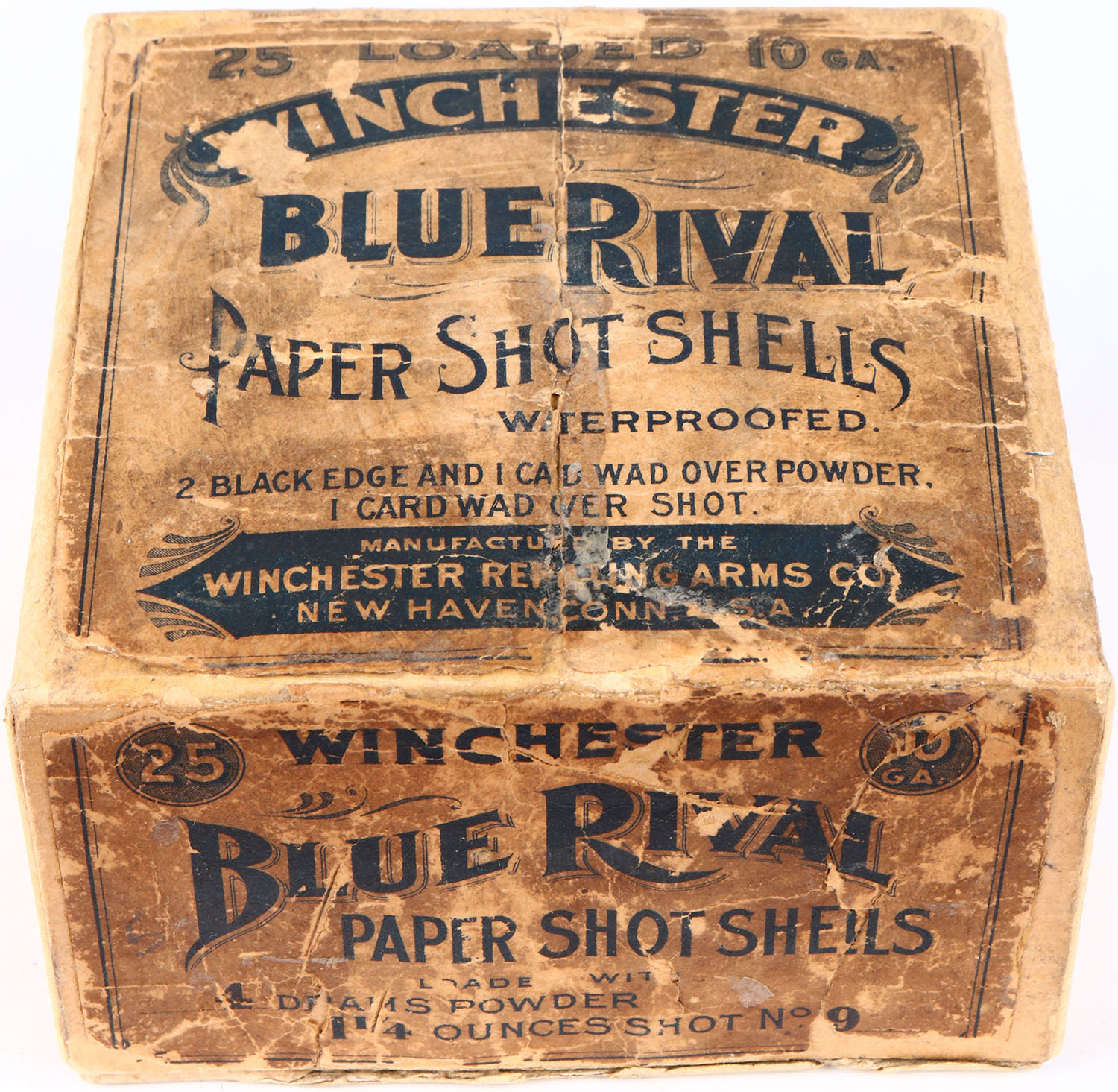 Winchester, Blue Rival, 10 Gauge, 2pc., Empty., Shot Size 9, Buff box with buff & black label, box has seam split, tape repair, & age soiling with nice label.* Grade: Very Good ++ - Value: 600 to 1200