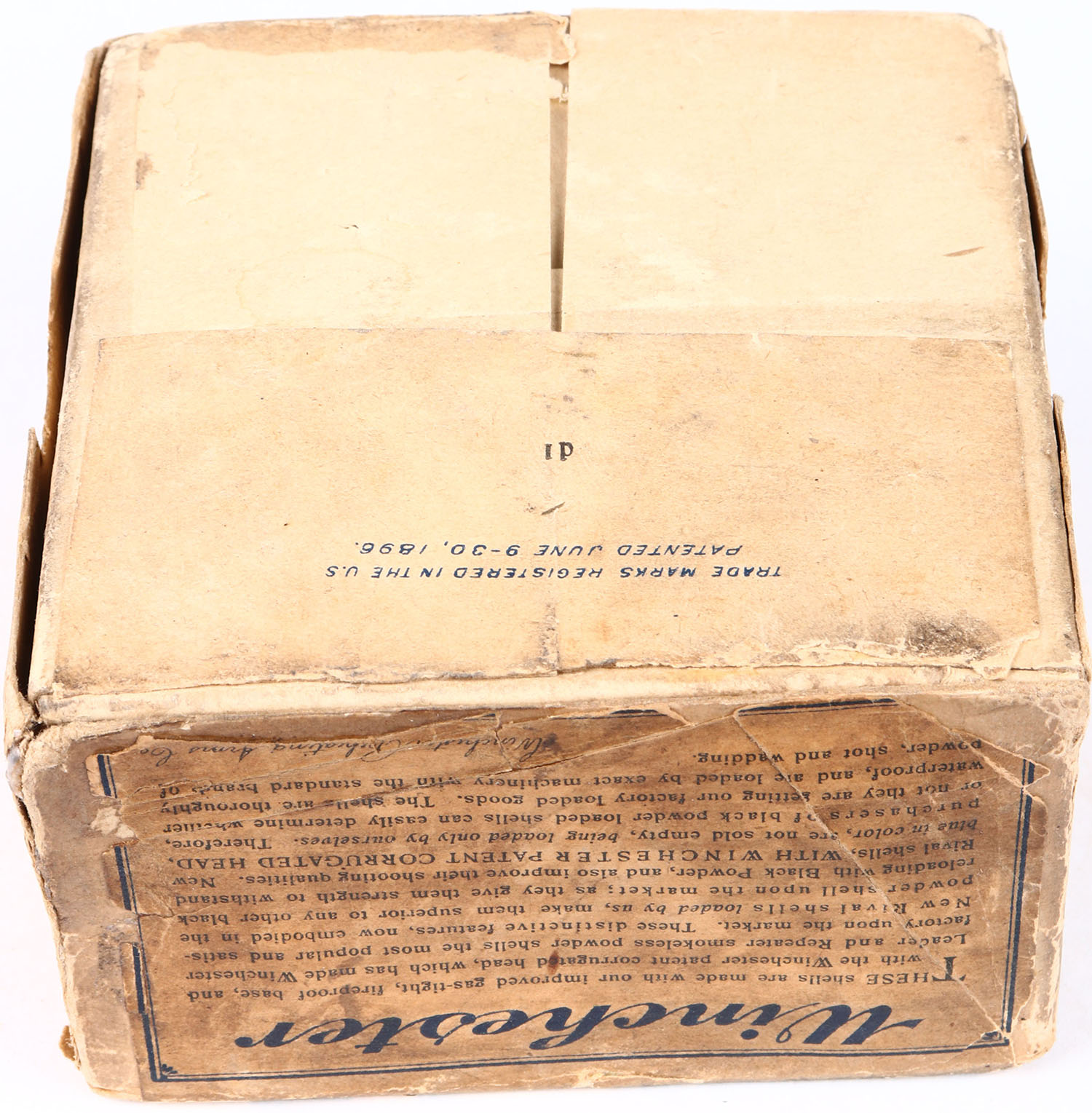 Winchester, New Rival, Corrugated Head, 12 Gauge, 2pc., Empty., Shot Size 5, Buff box with buff & blue label, box has glue & tape repair, age soiling with very nice label.* Grade: Excellent - Value: 300 to 800