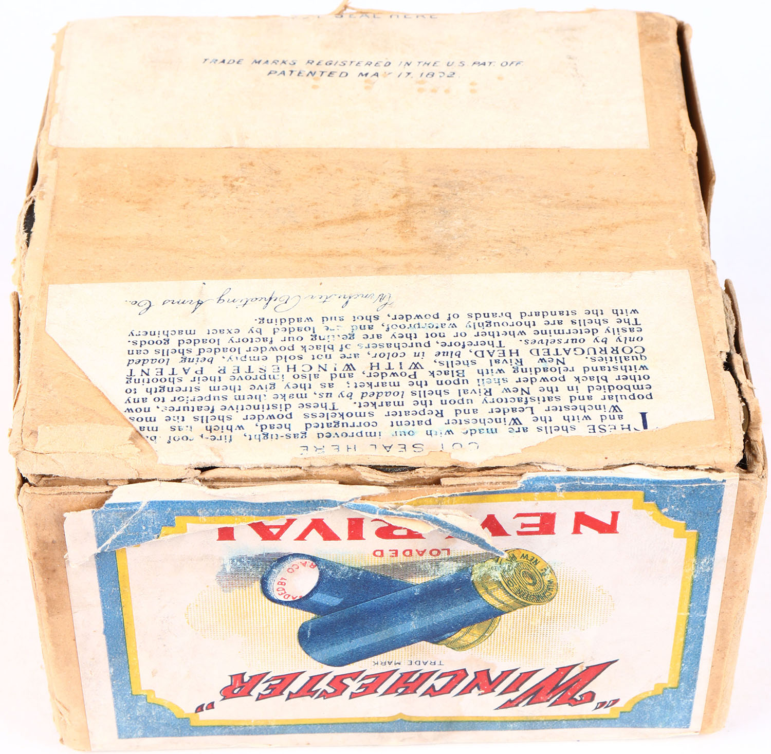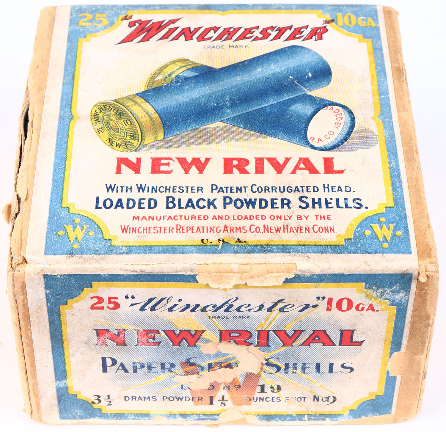 Winchester, NEW RIVAL, 10 GAUGE, 2pc., Full, Shot Size 9, buff box with multi-colored label that pictures the two crossed shells, loaded BLACK POWDER shells, Box has seam splits, scuffing on side with nice colors, Shells are very good. Grade: Excellent - Value: 80 to 250