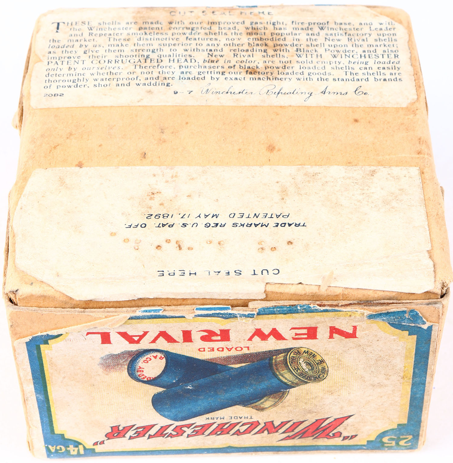 Winchester, NEW RIVAL, 14 GAUGE, 2pc., Partial 5rds, Shot Size 5, buff box with multi-colored label that pictures the two crossed shells, loaded BLACK POWDER shells, Box has seam split, age soiling, with very nice colors, Shells are good. Grade: Very Good ++ - Value: 80 to 300