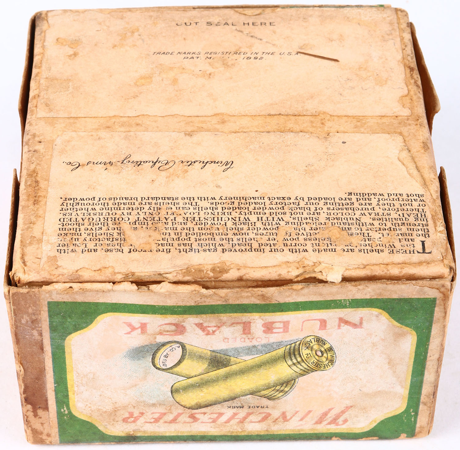 Winchester, NUBLACK, 12ga, 2pc., Empty, shot size 6, buff box with multi-colored label that pictures three mallards flying over water, Yellow shells on one side panel, Box is very solid, has edge wear with age soiling, & good colors. Grade: Very Good ++ - Value: 50 to 200