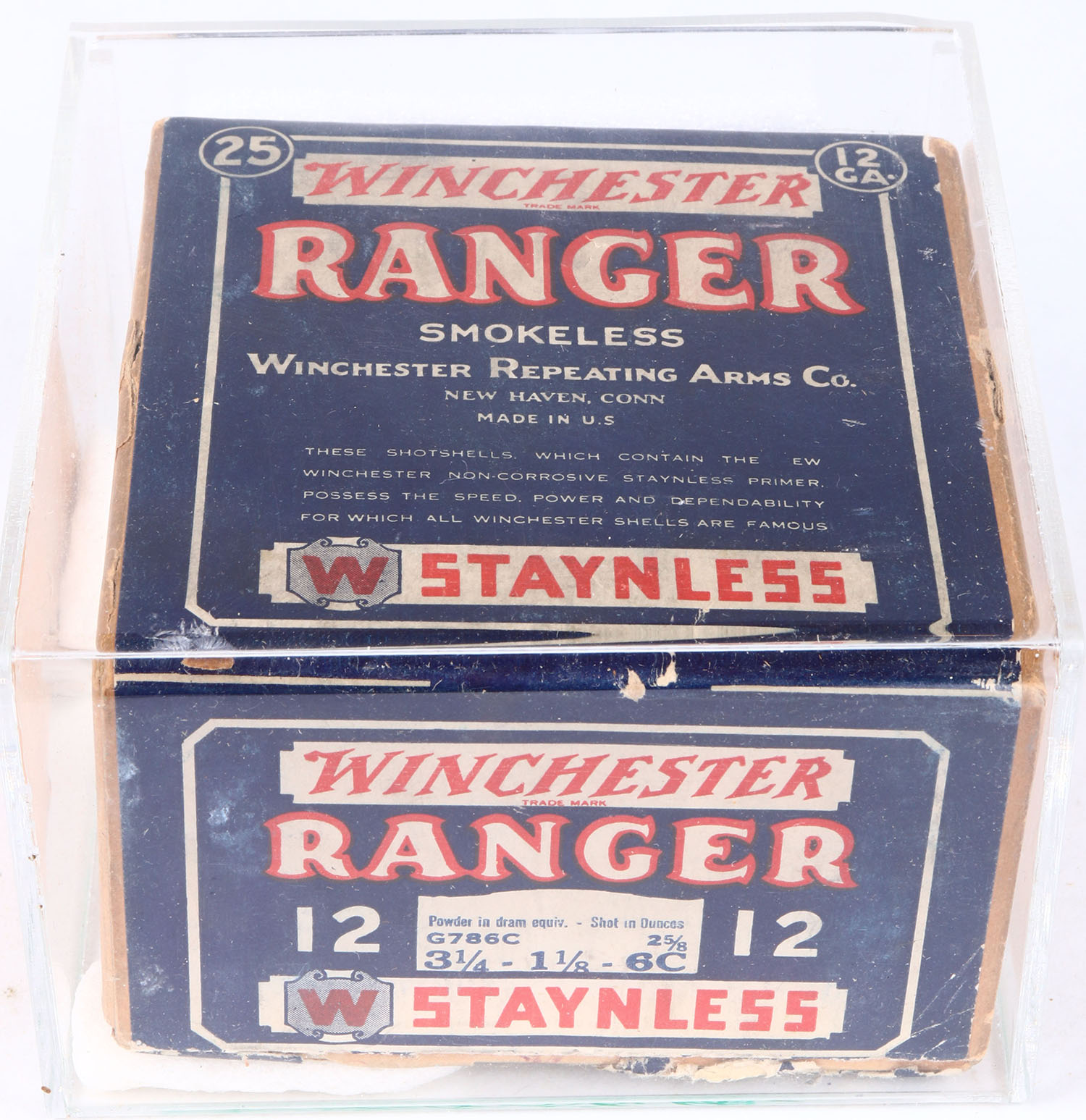Winchester, Ranger, STAYNLESS, 12ga., 2pc., Full, shot size 6C, buff box with blue, red & white label, box is very solid with minor shell protrusions & great colors, With Acrylic Box. Grade: Excellent + - Value: 100 to 400