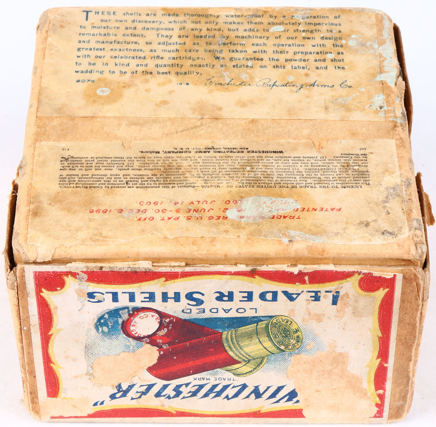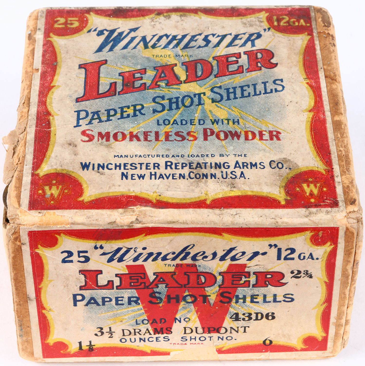 Winchester, LEADER, with insert, 12ga, 2pc., FULL, shot size 6, Buff box with red, yellow, white & black label showing lightning bolt, box has missing part on left side with age soiling, nice color to label & light scuffing, Shells are excellent. Grade: Very Good ++ - Value: 50 to 300