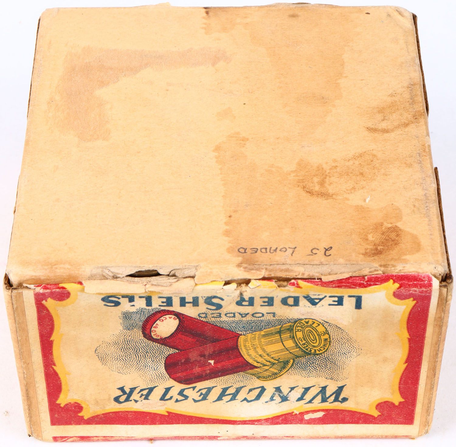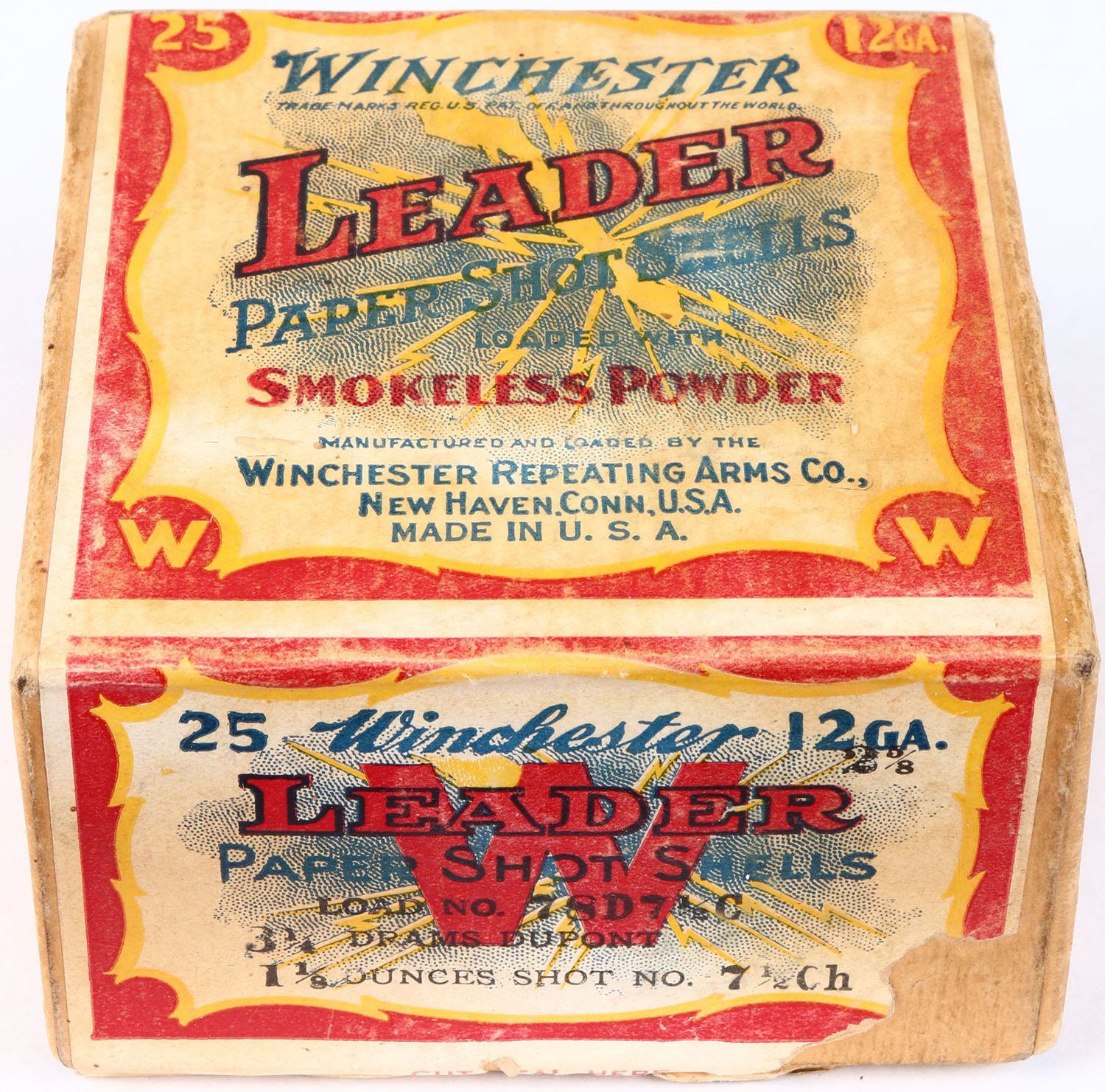Winchester, LEADER, 12ga, 2pc., Full of incorrect shot size, shot size 7 1/2, Buff box with red, yellow, white & black label showing lightning bolt, box has light age soiling & no bottom label. Shells are very good. Grade: Excellent - Value: 40 to 200