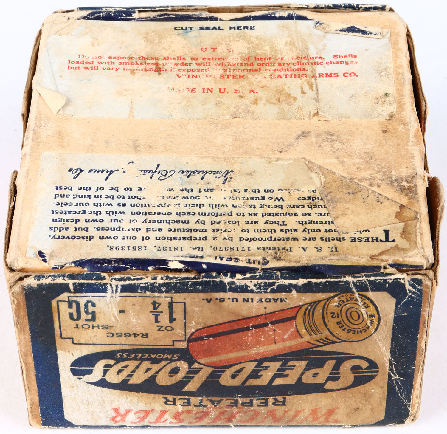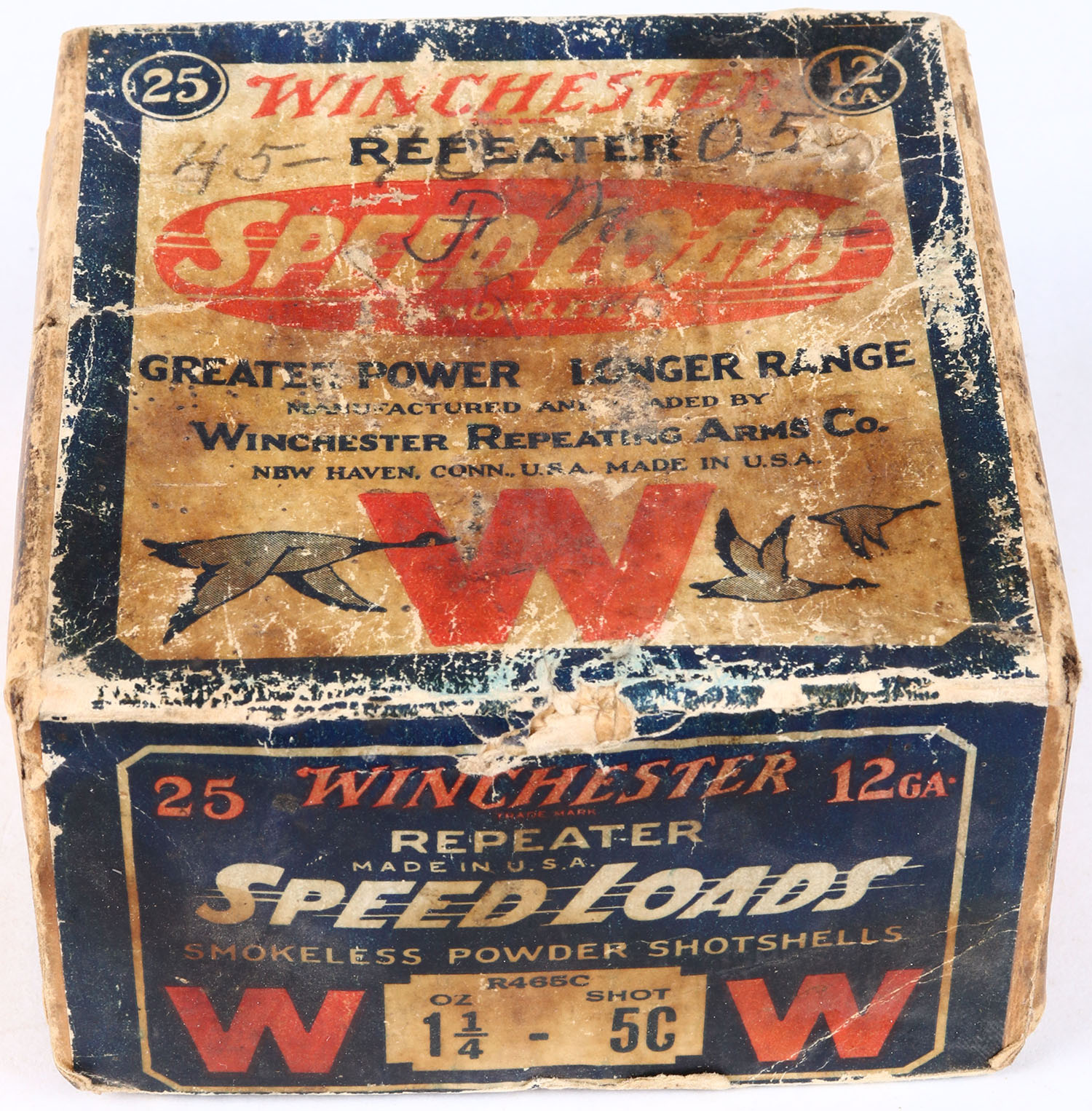 Winchester REPEATER Speed Loads, 12 Gauge, 2pc., Empty., shot size 5C, buff box with dark blue red & white paper label, Box is solid with nice colors to label, has age soiling, edge wear, & scuffing, RARE with the REPEATER markings. Grade: Very Good - Value: 20 to 150