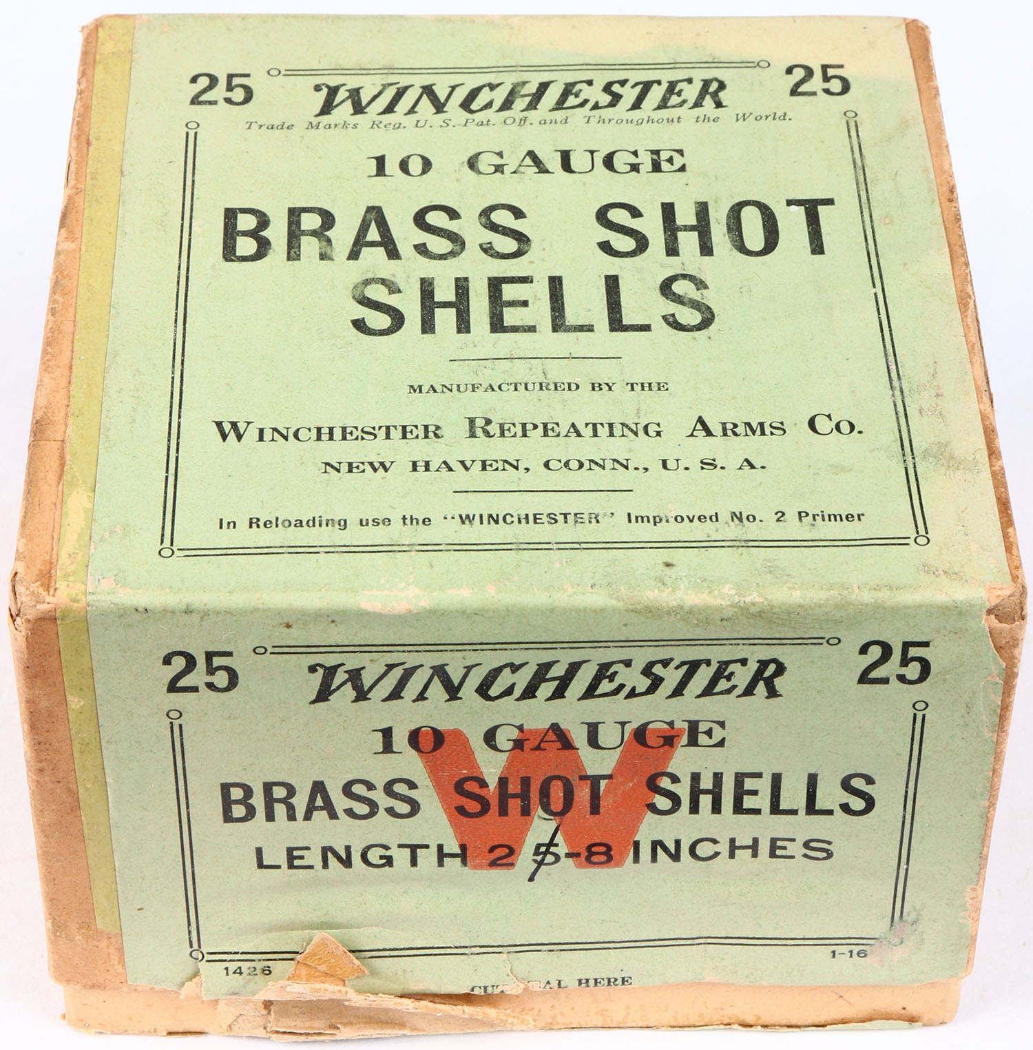 Winchester, BRASS SHOT SHELLS, 10ga., 2pc., Full, Length 2 5/8'', buff box with green, red & black label, box has seam splits with light age soiling & mild shell protrusions, brass shells are very good. Grade: Excellent - Value: 40 to 100