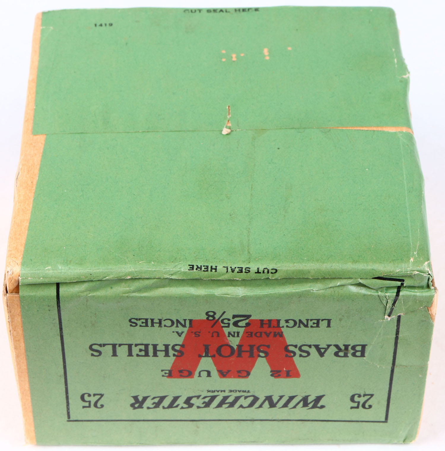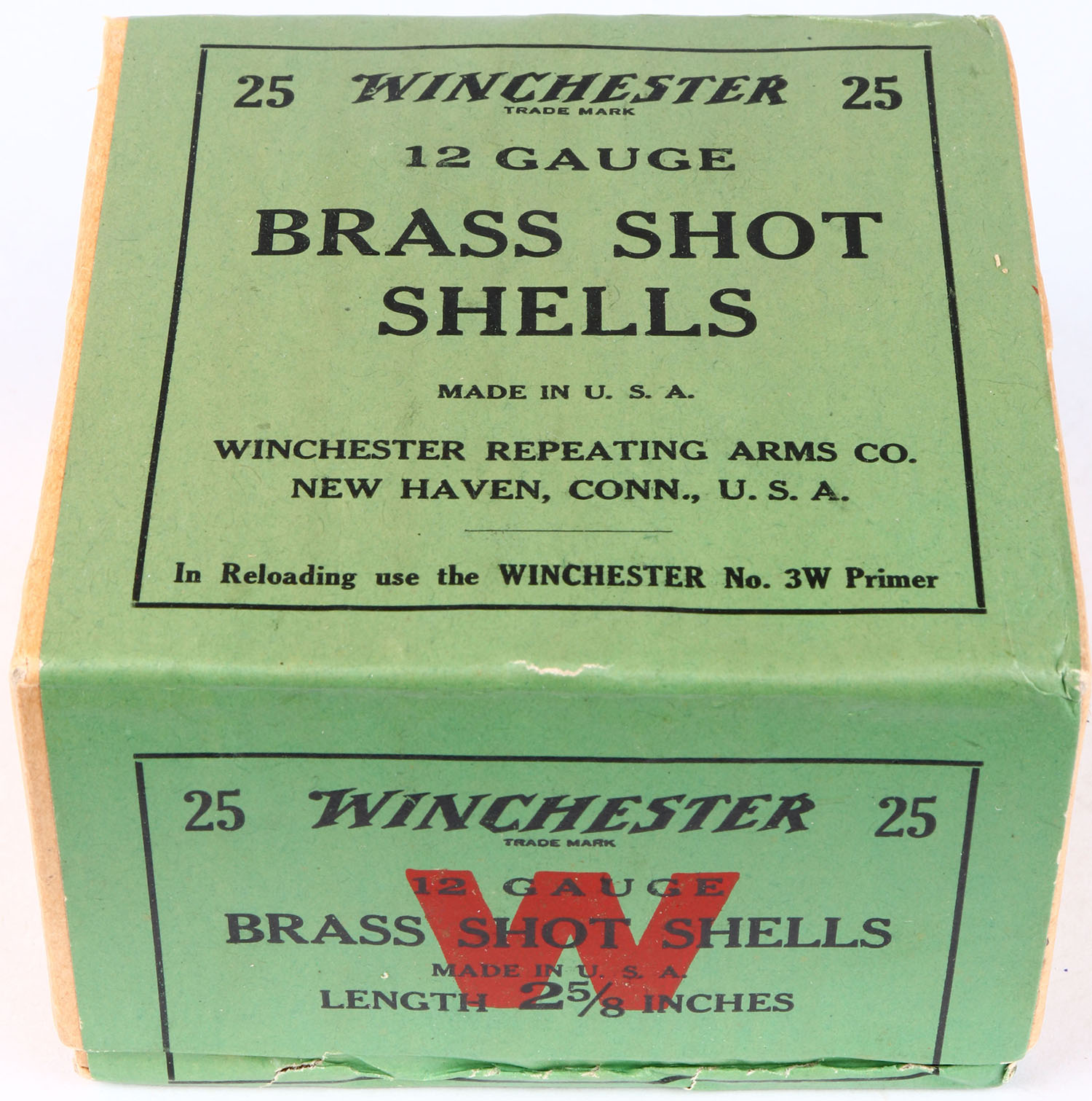 Winchester, BRASS SHOT SHELLS, 12ga., 2pc., FULL & SEALED, Length 2 5/8'', buff box with green, red & black label, box is very solid & has Minty colors to label. Grade: MINT - Value: 50 to 200