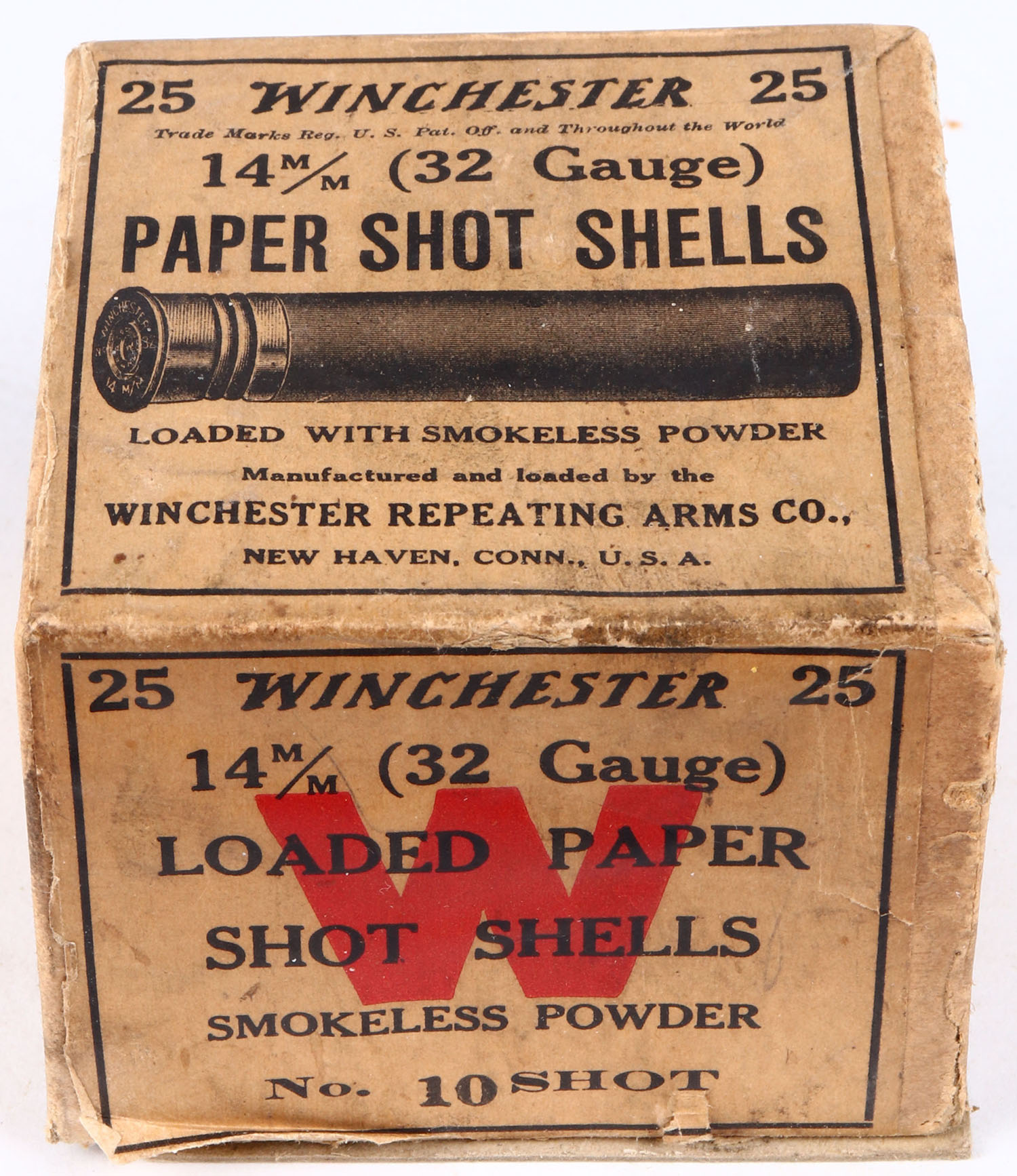 RARE Winchester, 32 GAUGE! 14m/m (32 Gauge), 2pc., FULL, PAPER SHOT SHELLS, shot size 10, buff box with buff, red & black label, bottom of box is disconnected, box has light edge wear, VERY RARE & HARD TO FIND IN 32 GAUGE. Shells are good. Grade: Excellent - Value: 150 to 600