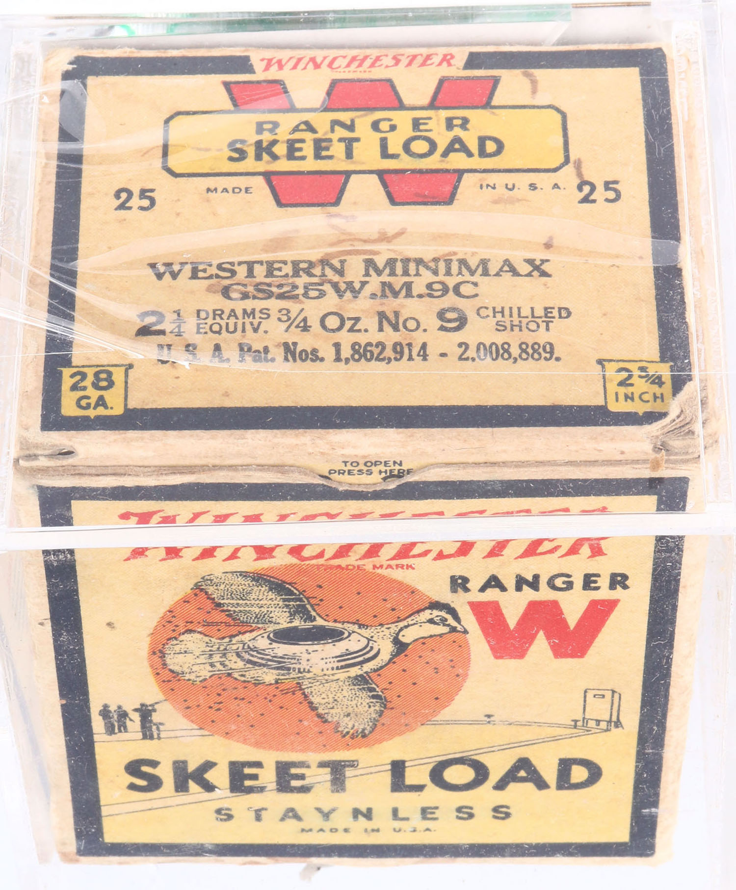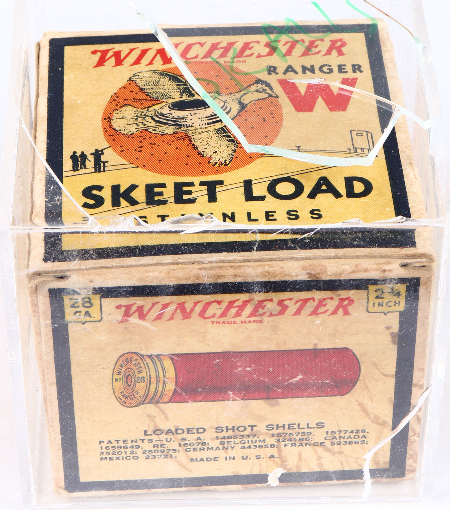 Winchester, RANGER SKEET LOAD, 28ga, 1pc., Full, White, black & red box that pictures flying Quail with skeet in body & shot all around, Staynless, 2 3/4'', Loading: 2 1/4 Drams 3/4 Oz. 9 Chilled Shot, Box is very solid with light soiling excellent colors, Shells are excellent. RARE BOX. Grade: Excellent + - Value: 200 to 800