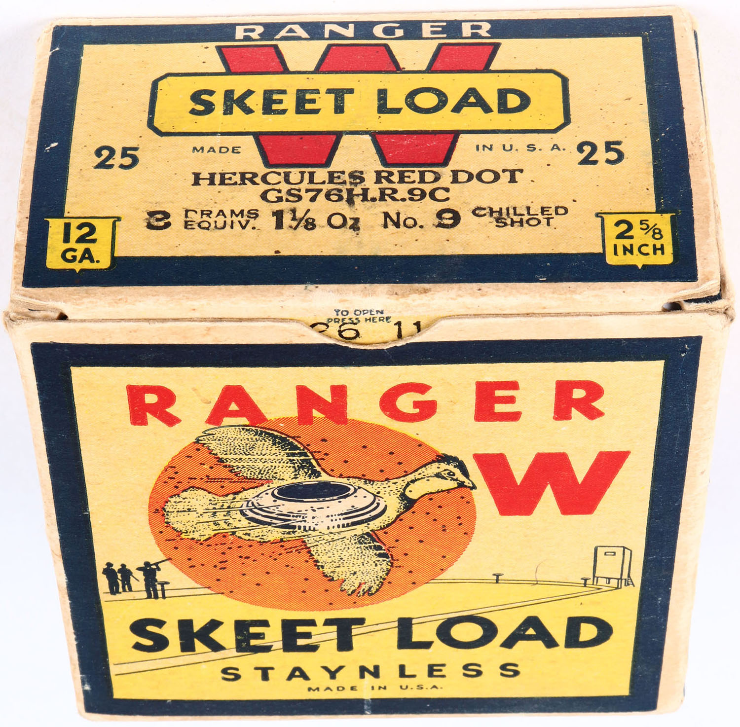 Winchester, RANGER SKEET LOAD, Hercules Red Dot, 12ga, 1pc., Partial 20rds with all being incorrect shot size, White, blue & red box that pictures flying Quail with skeet in body & shot all around, Staynless, 2 5/8'', Loading: 3 Drams 1 1/8 Oz. 9 Chilled Shot, Box is very solid with great colors, Shells are excellent. RARE BOX.* Grade: Excellent ++ - Value: 100 to 400