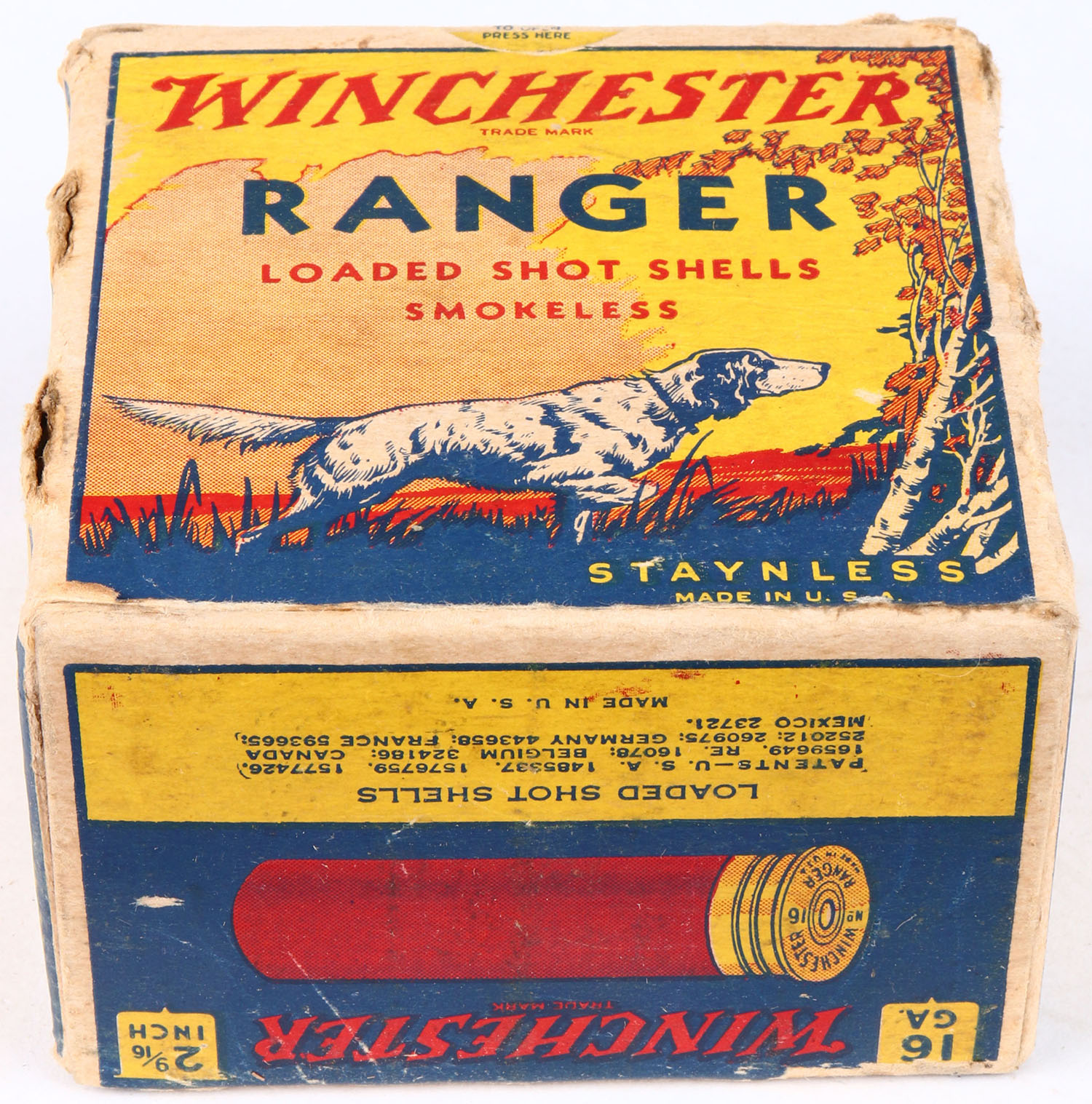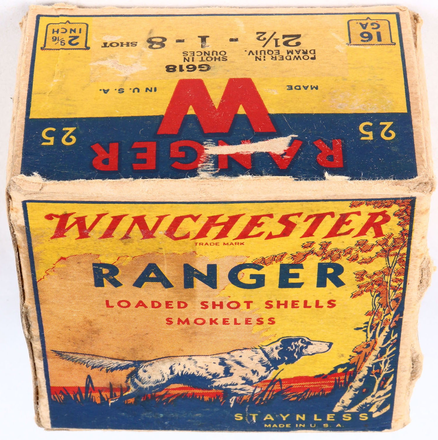 Winchester, Ranger, 16 Gauge, 1pc., Full, shot size 8, multi colored box, dog on point, shells 2 9/16'', box is solid, shell protrusions, light edge wear, and some scuffing with nice colors, shells are very good. Grade: Very Good ++ - Value: 20 to 60