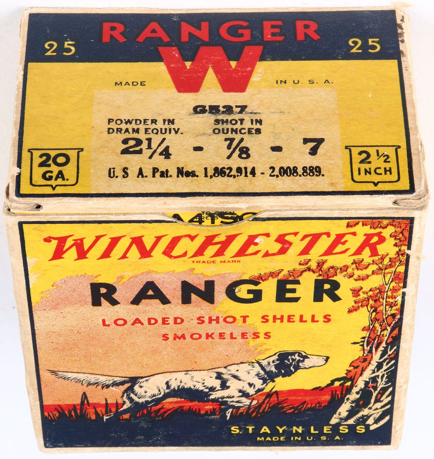 Winchester, Ranger, 20 Gauge, 1pc., Full, shot size 7, multi colored box, dog on point, shells 2 1/2'', box is very solid with top and inside flap tearing, has bright colors, shells are excellent. Grade: Excellent ++ - Value: 40 to 120