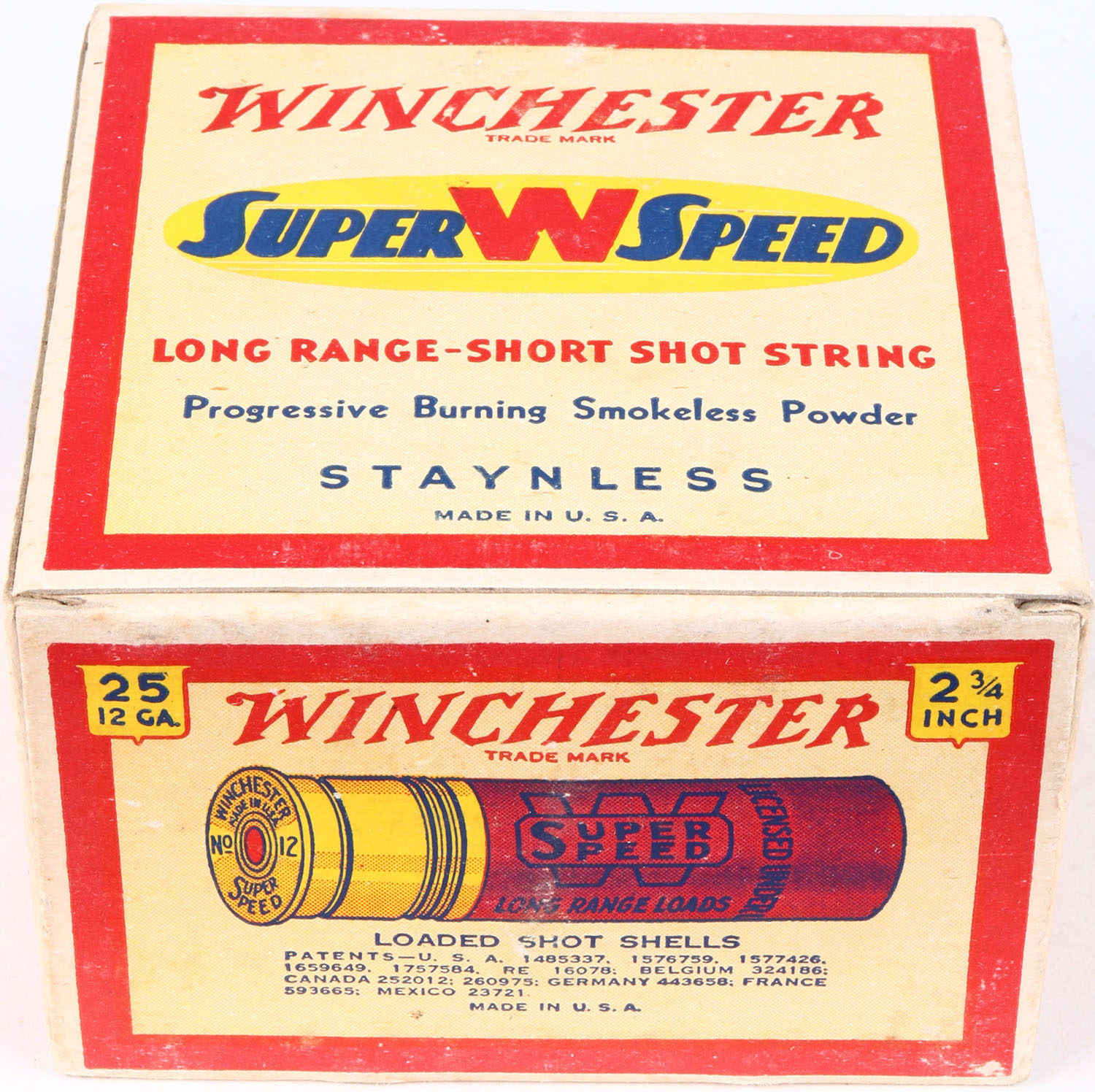 Winchester, Super W Speed, 12ga., Staynless, 2 3/4 in., 1pc., Full, shot size 6, cream, red, blue and yellow box, box is very solid with great colors & light soiling, shells are excellent. Grade: Excellent ++ - Value: 16 to 30