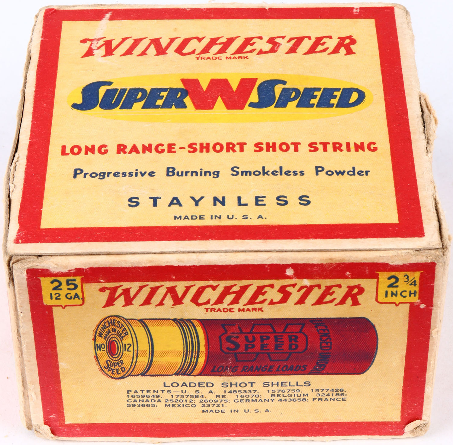 Winchester, Super W Speed, 12ga., Staynless, 2 3/4 in., 1pc., Full, shot size 6, cream, red, blue and yellow box, box with very nice colors, has seam split with shell protrusions, shells are excellent. Grade: Excellent - Value: 16 to 30