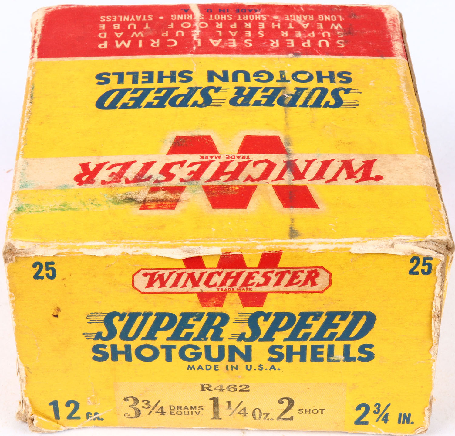 Winchester, Super Speed, 12ga., 1pc., Partial 24rds, 2 3/4''., shot size 2, red, yellow & blue box, box has scuffing, soiling, & nice colors, shells are very good. Grade: Very Good ++ - Value: 6 to 20