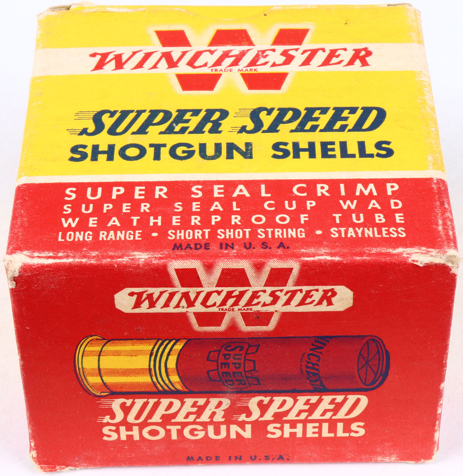 Winchester, Super Speed, 20ga., 1pc., Full, 2 3/4''., shot size 6, red, yellow & blue box, box is very solid with very nice colors, shells are excellent. Grade: Excellent + - Value: 10 to 40