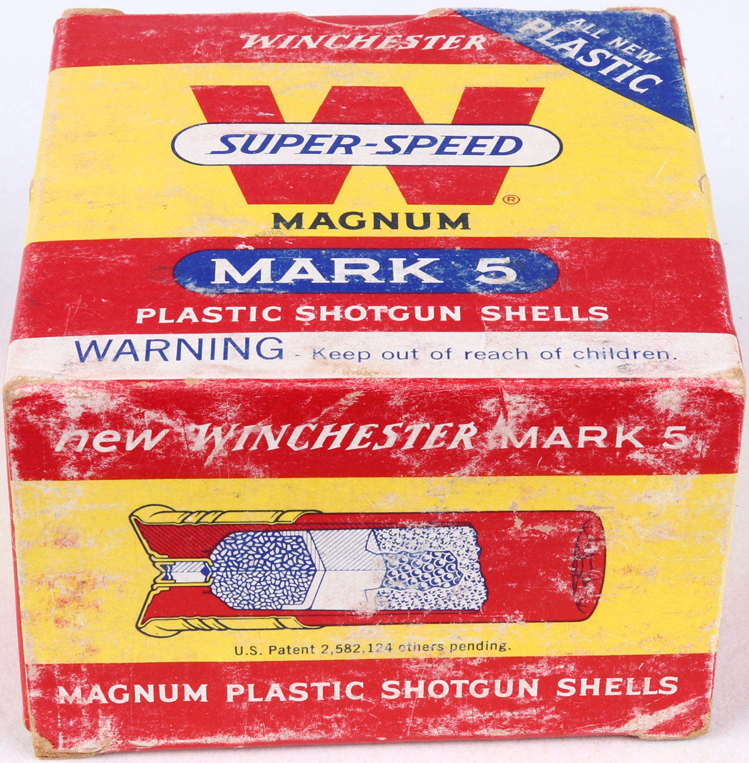 Winchester, Super Speed Mark 5, 16 ga., 2 3/4'', 1pc., Full, shot size 4 Magnum, yellow, blue & red box, box is solid with light soiling, shells are excellent. Grade: Excellent + - Value: 10 to 30