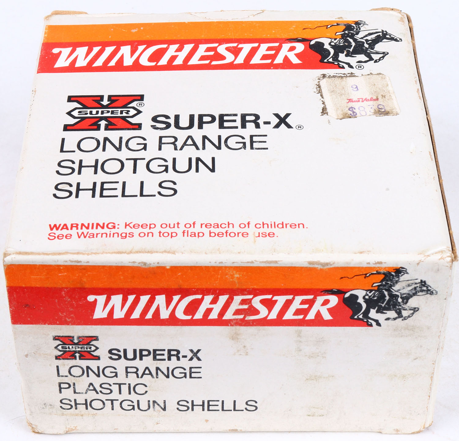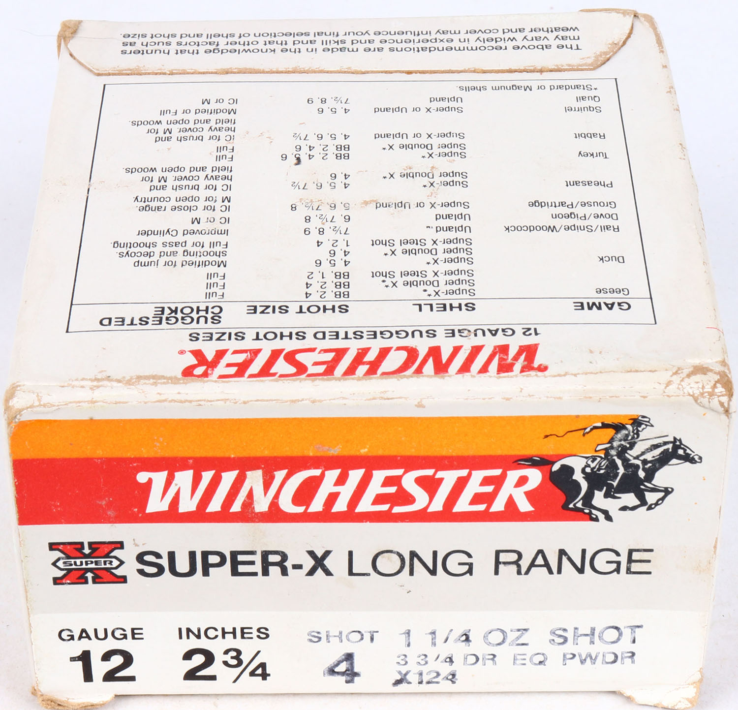 Winchester, Super X Long Range, 12ga., Partial 21rds, shot size 4, red, orange, & white box, solid box, ammo is very good. Grade: Very Good ++ - Value: 10 to 30