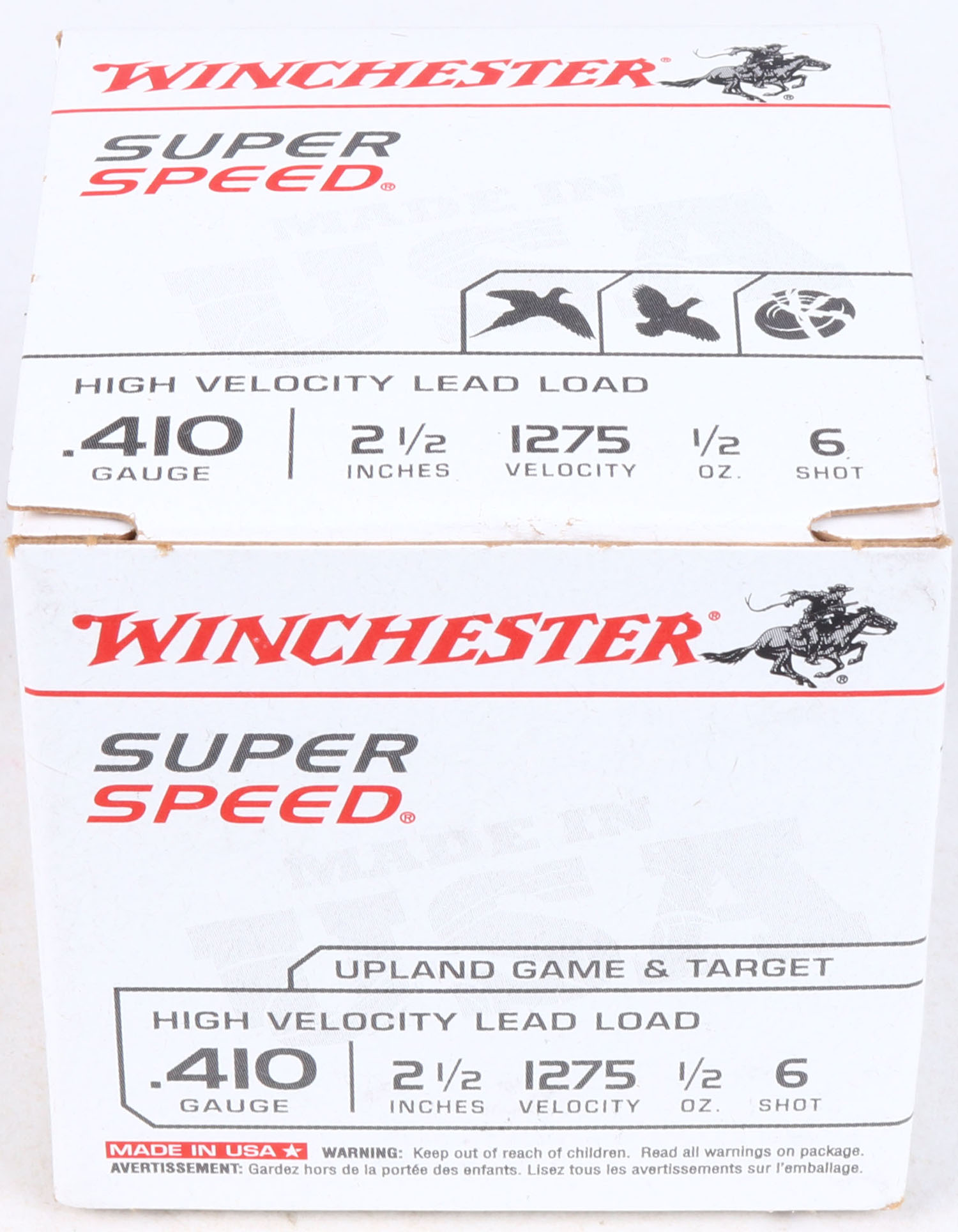 Winchester, 410ga., 1pc., Full, shot size 6, box is solid & shells are excellent. Grade: Excellent + - Value: 8 to 30