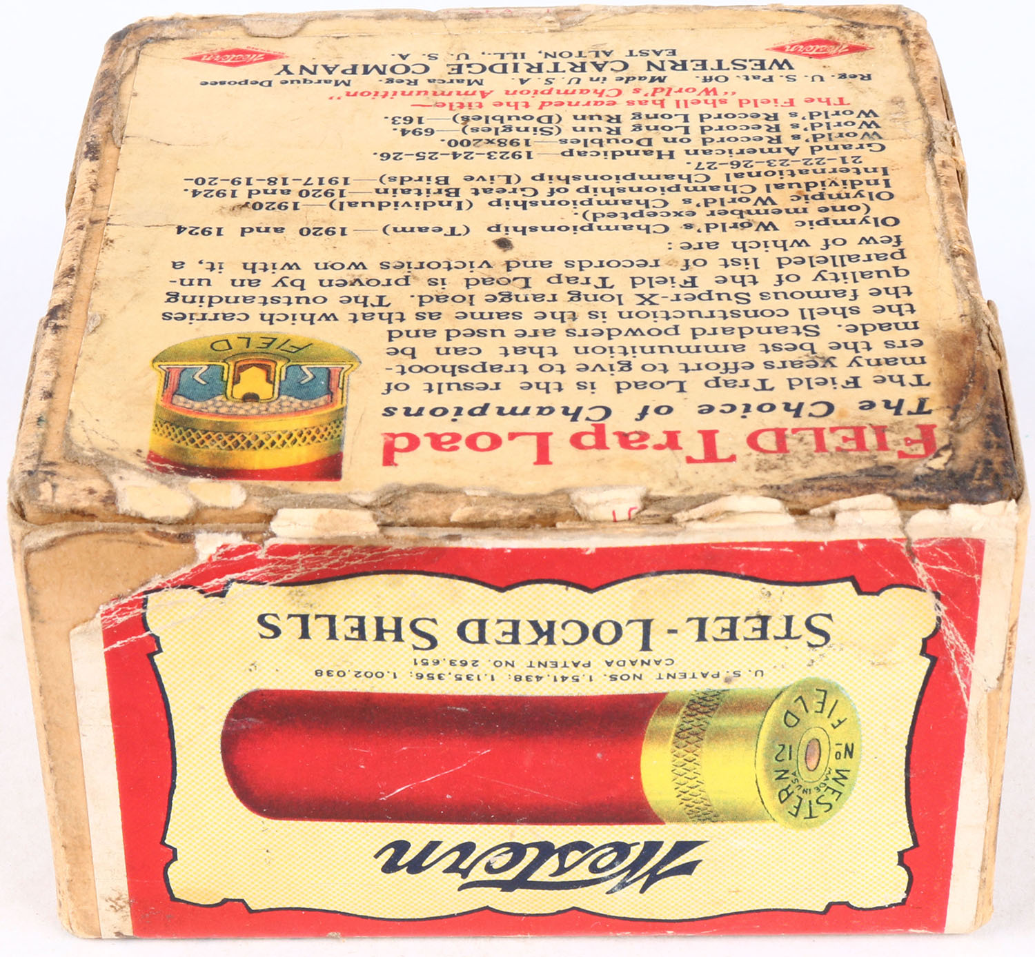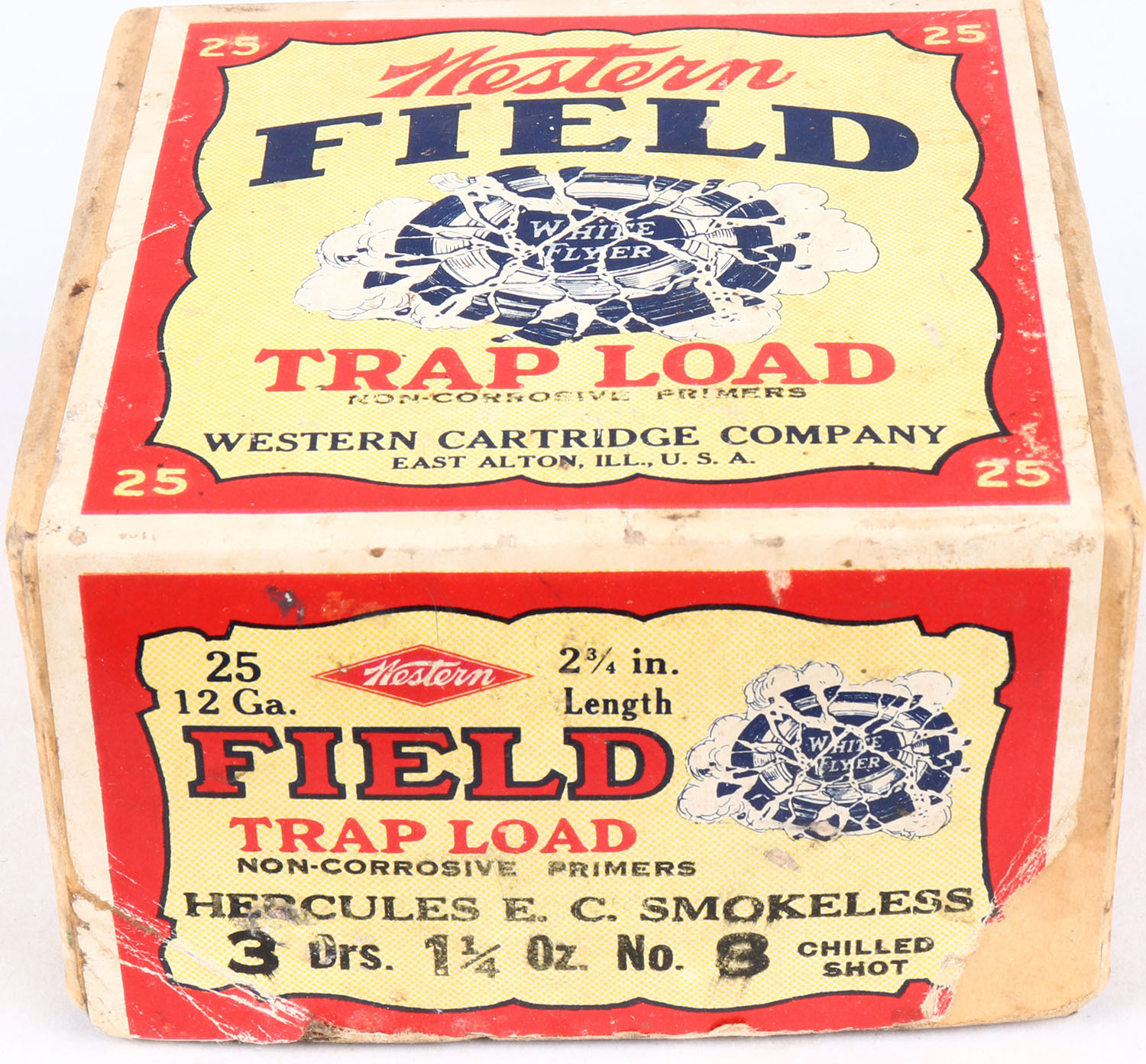 Western, Field Trap Load, 12ga., 2pc, Empty, shot size 8 Chilled, box has clap pigeon shattering, has light age soiling, light edge wear with very good label. Grade: Excellent - Value: 500 to 1200