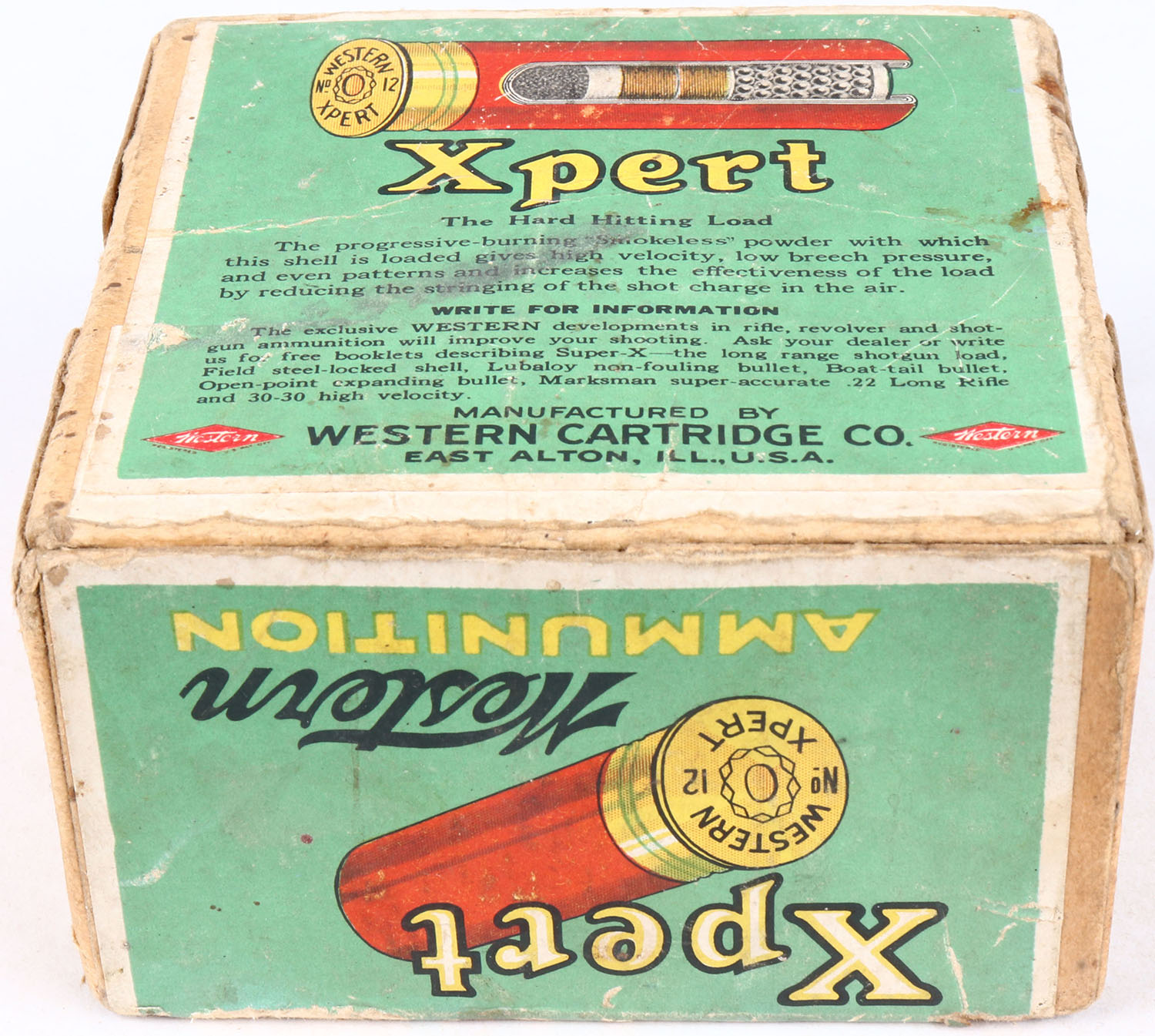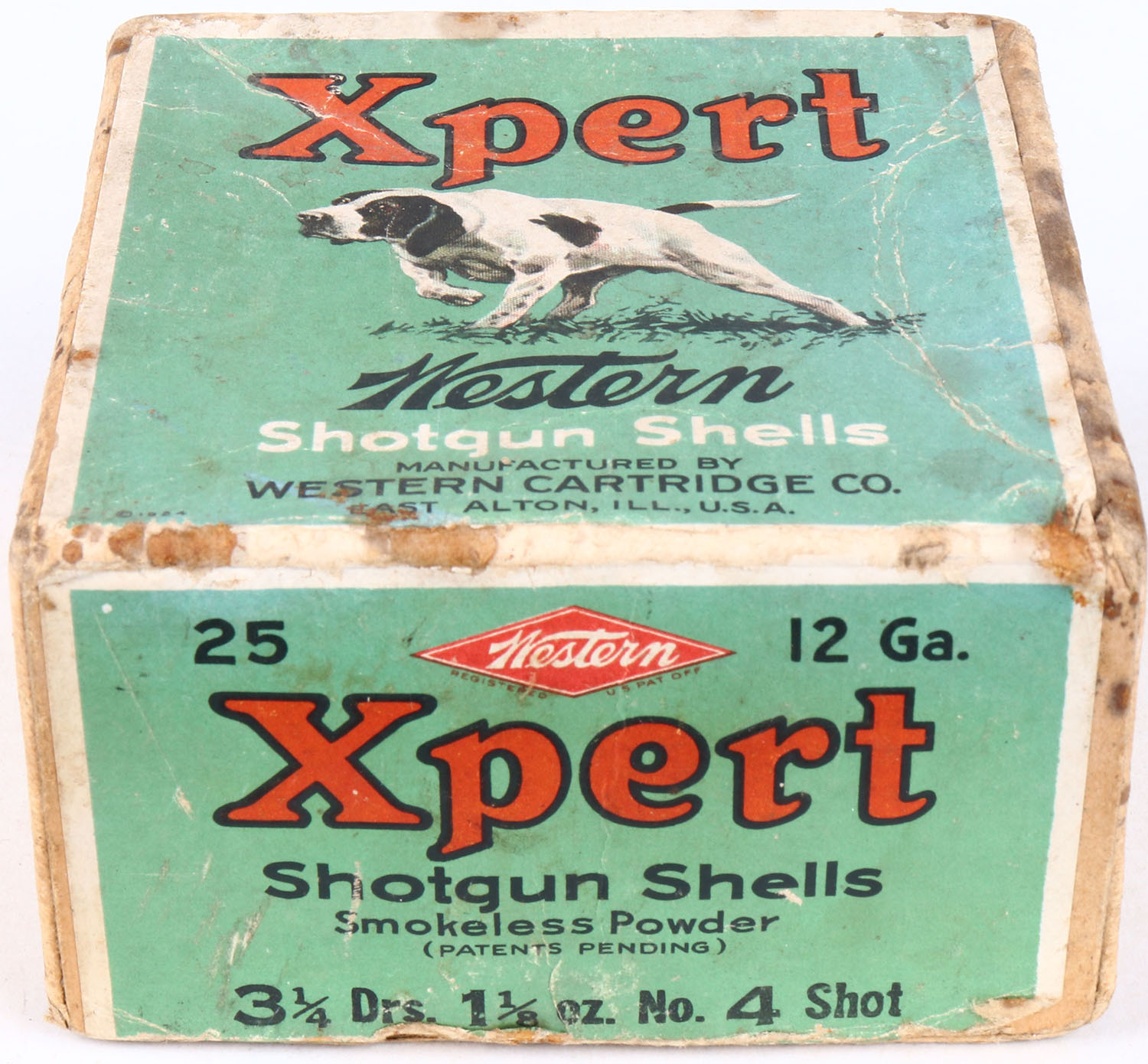 Western, Xpert, 12ga., 2pc., Empty, shot size 4, buff box with green paper label that pictures the pointer, box has age soiling with very nice colors to label. Grade: Very Good ++ - Value: 100 to 300