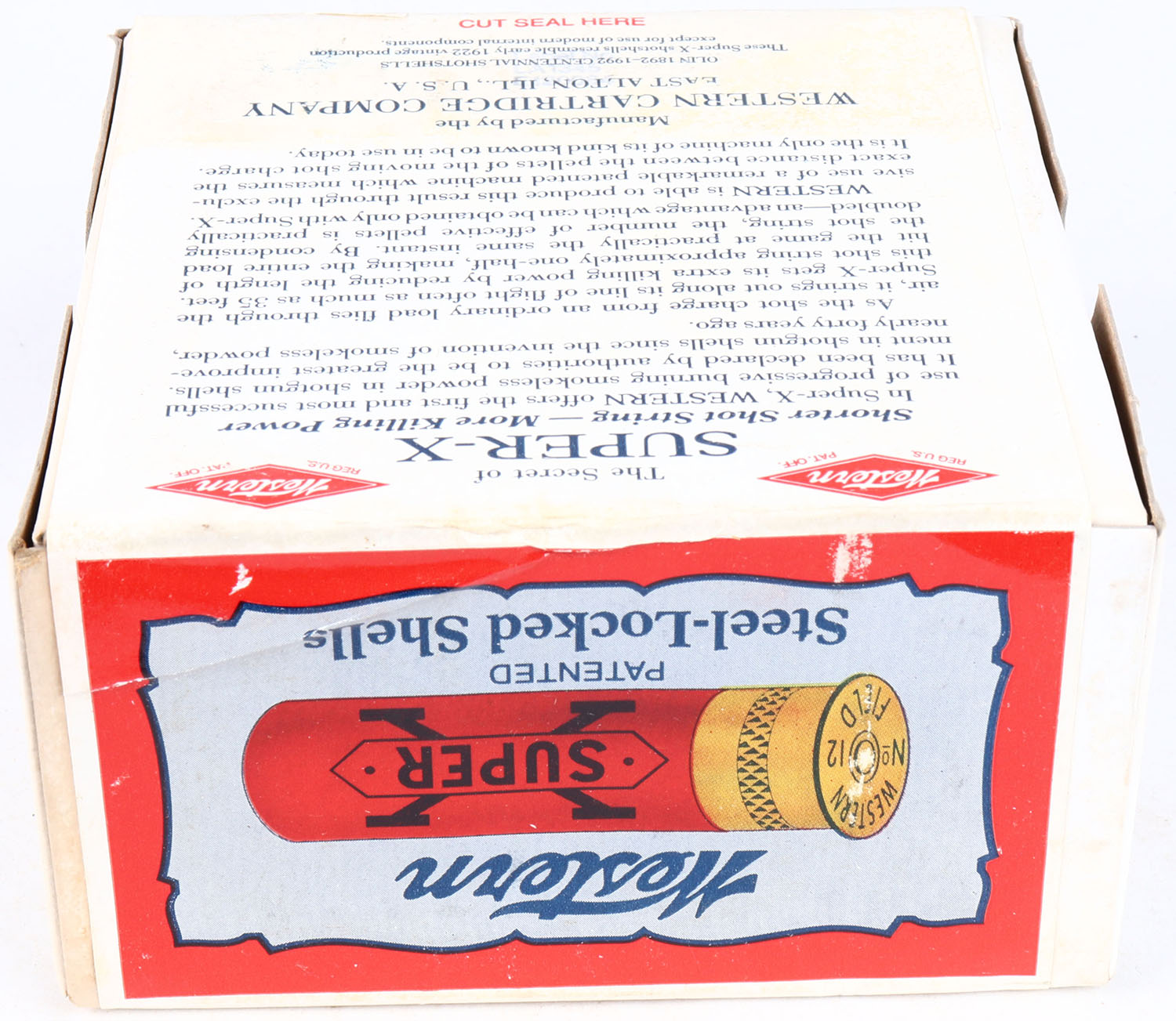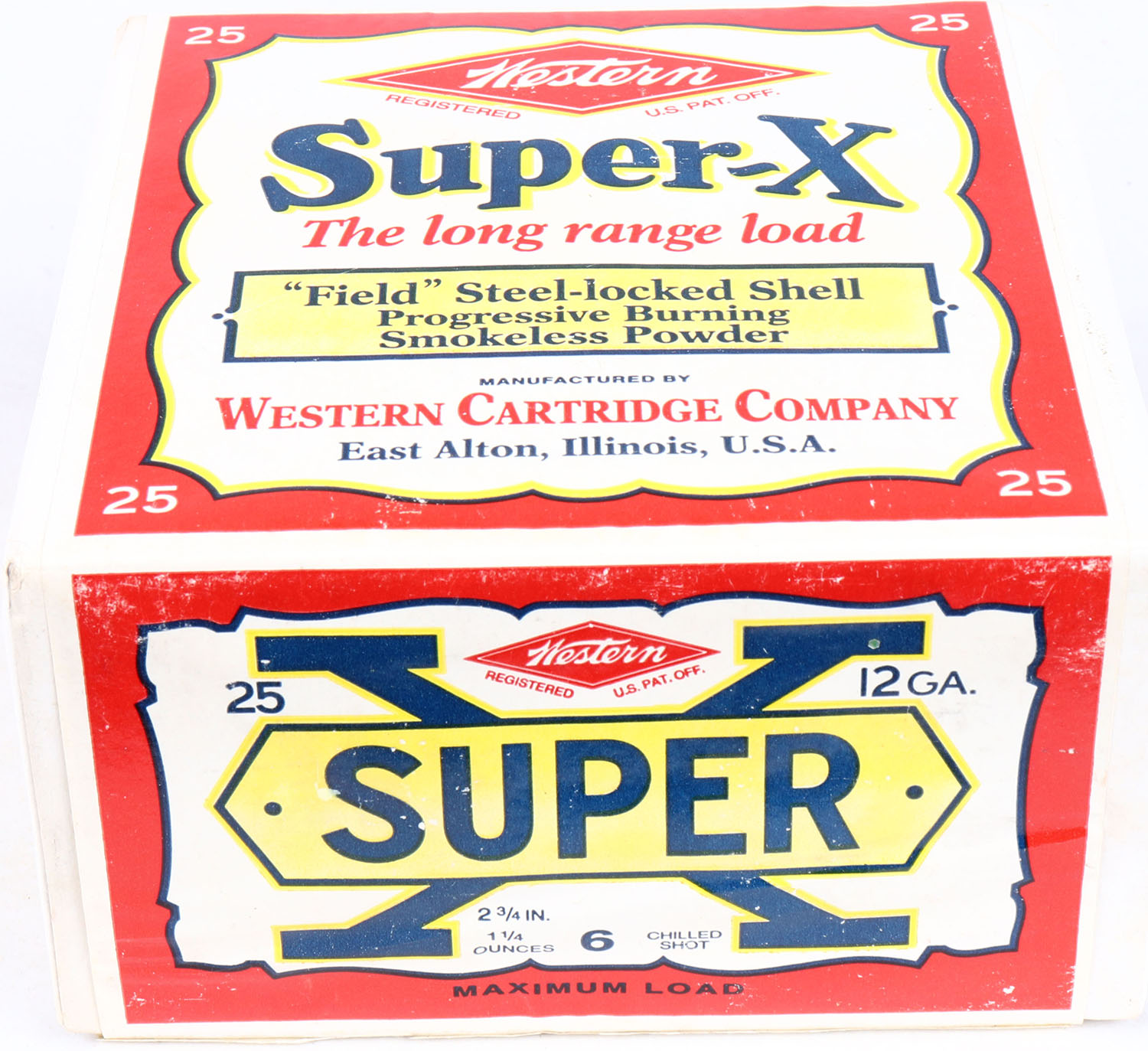 Western, Super-X, 12ga., 2pc., FULL & SEALED, shot size 6 Chilled Shot, 2 3/4'', white box with multi colored label, box & label are great, Circa 1990's. Grade: Excellent ++ - Value: 20 to 80