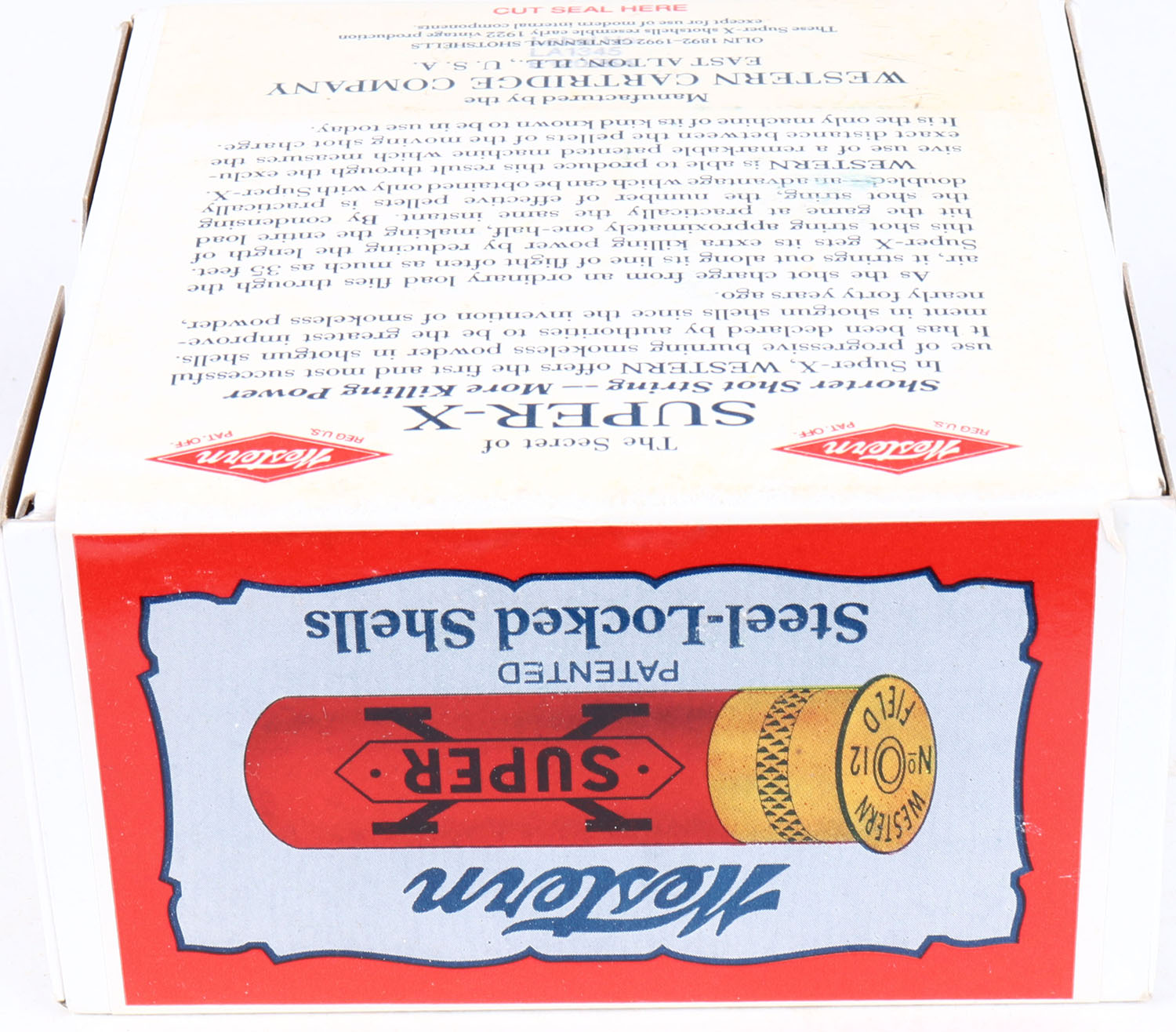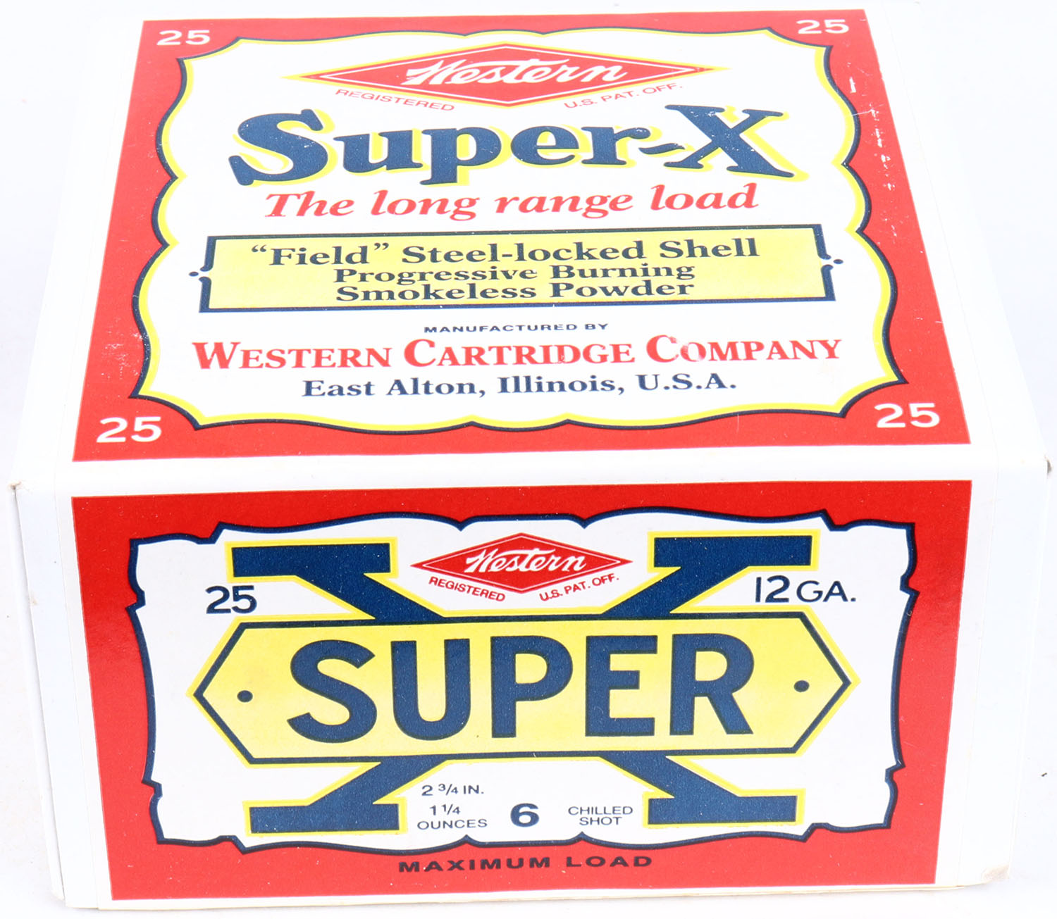 Western, Super-X, 12ga., 2pc., FULL & SEALED, shot size 6 Chilled Shot, 2 3/4'', white box with multi colored label, box & label are minty, Circa 1990's. Grade: MINT - Value: 30 to 80