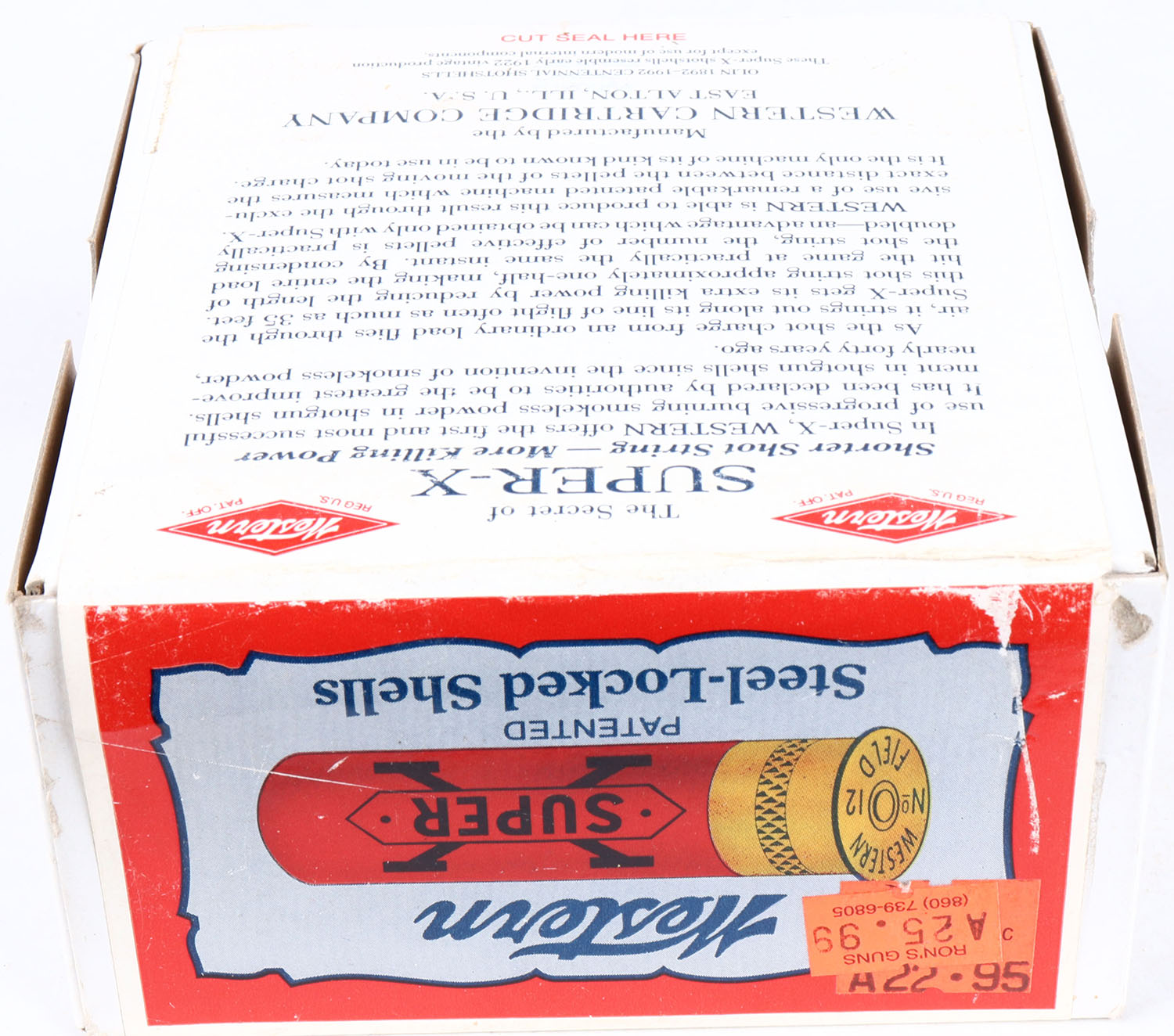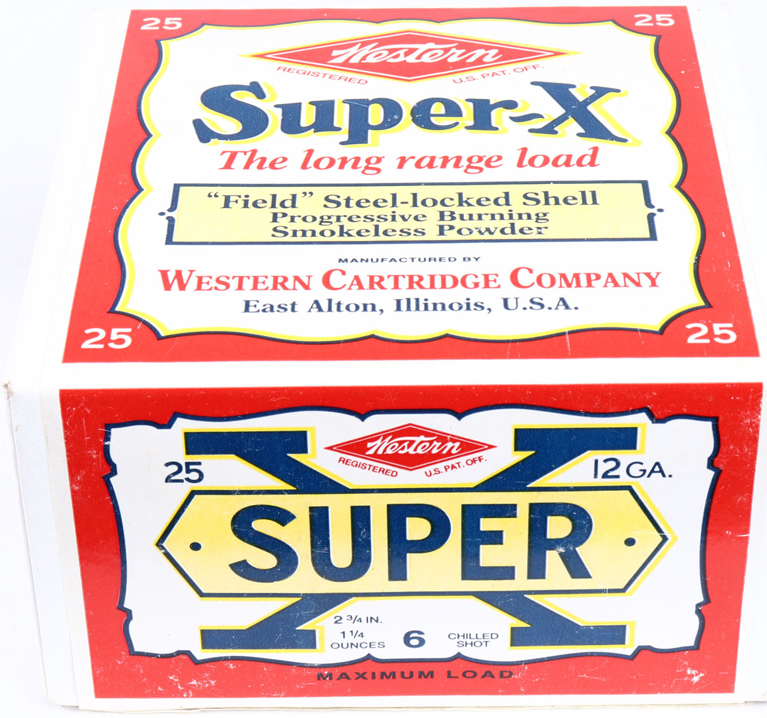 Western, Super-X, 12ga., 2pc., FULL & SEALED, shot size 6 Chilled Shot, 2 3/4'', white box with multi colored label, box & label are minty with small scuff, Circa 1990's. Grade: Excellent ++ - Value: 30 to 80
