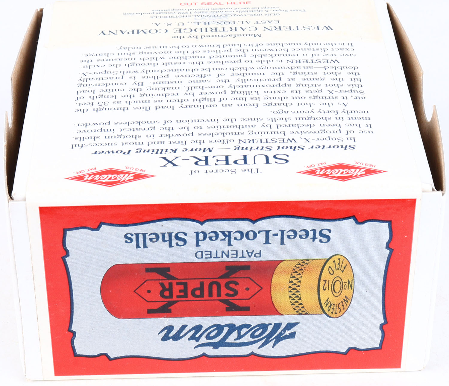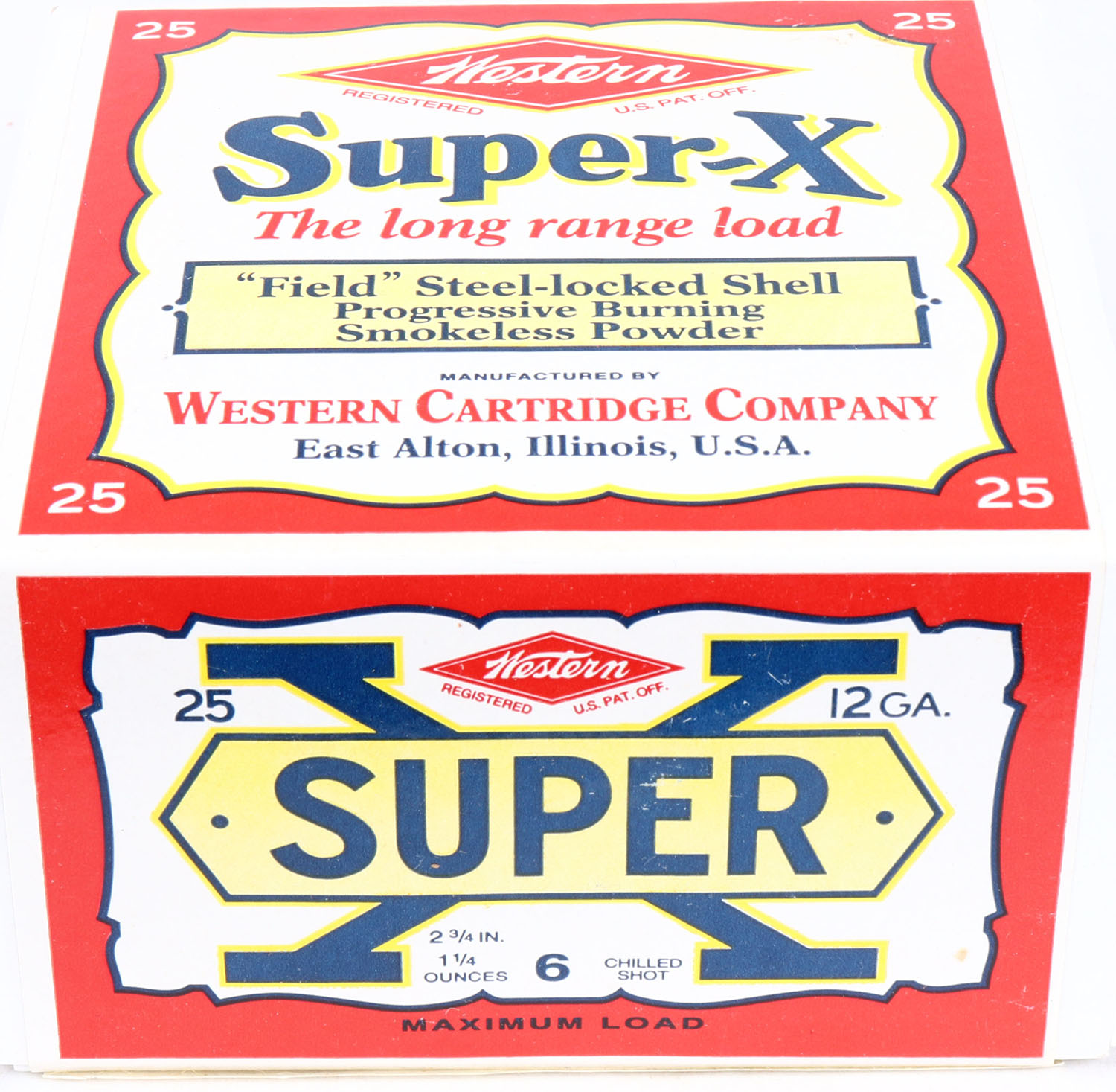 Western, Super-X, 12ga., 2pc., FULL & SEALED, shot size 6 Chilled Shot, 2 3/4'', white box with multi colored label, box & label are minty, Circa 1990's. Grade: MINT - Value: 30 to 80