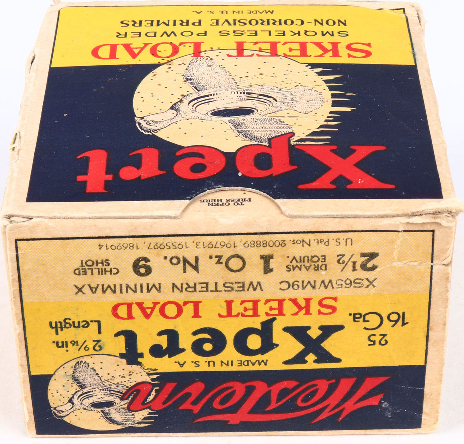 Western Xpert, SKEET LOAD, 16ga., 1pc., Full, white, blue & red box that pictures flying Quail with skeet in body & shot all around, Loading: 2 1/2 Drams 1 Oz. No. 9 Chilled Shot, box has bottom flap disconnected, shell protrusions & with great colors, shells are excellent. Grade: Excellent - Value: 100 to 400