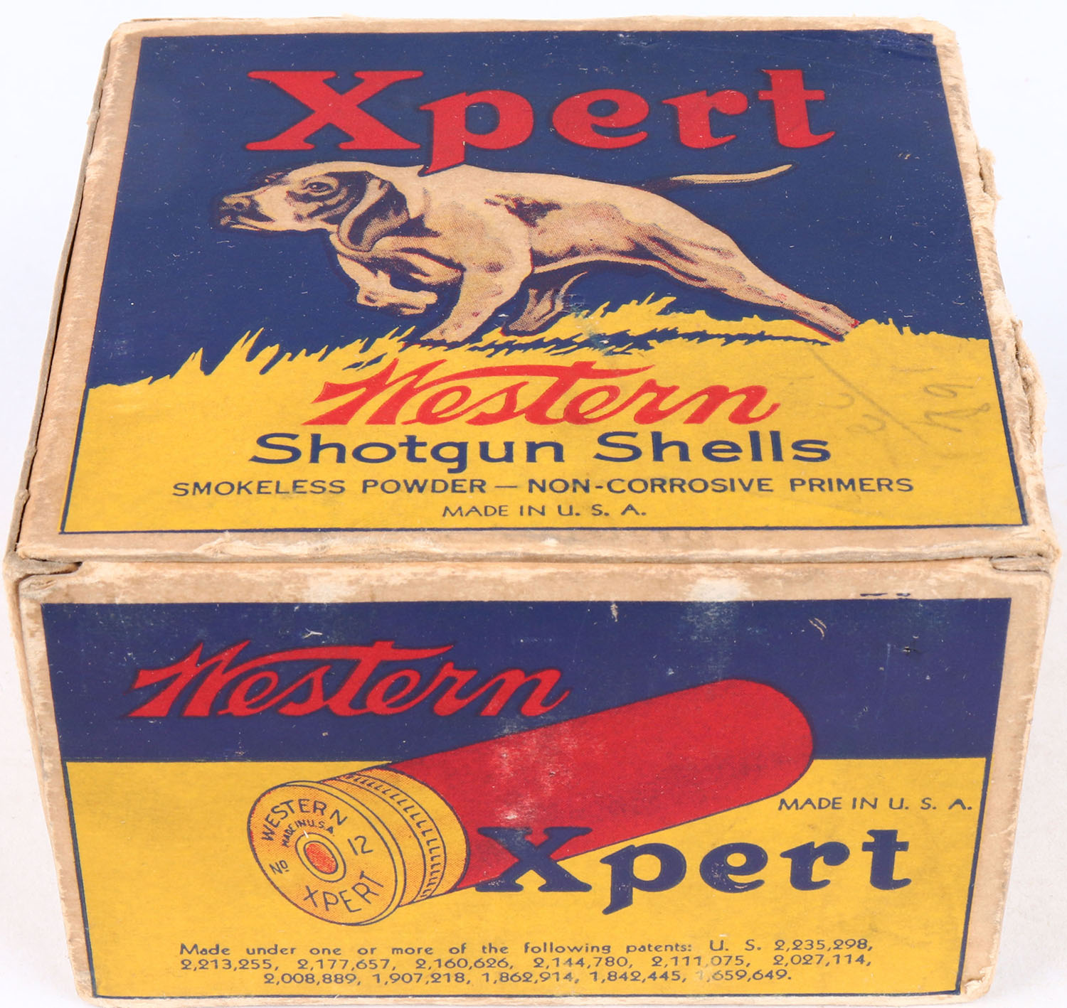 Western Cart. Co., Xpert, Steel Heads U.S. PROPERTY, 12ga., 1pc., FULL, blue, yellow & red box with a dog on point, Loading: 9 Pellets No. 00 BUCKSHOT, box has shell protrusions, edge wear and nice colors, ammo is excellent. Grade: Very Good ++ - Value: 40 to 100