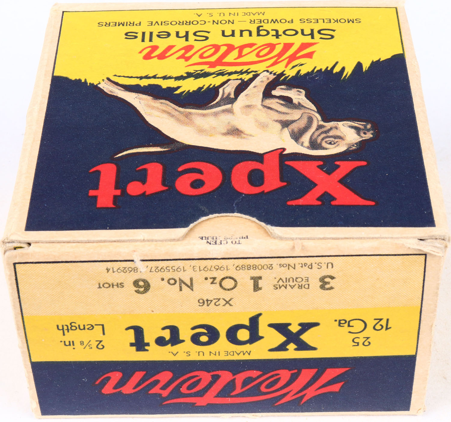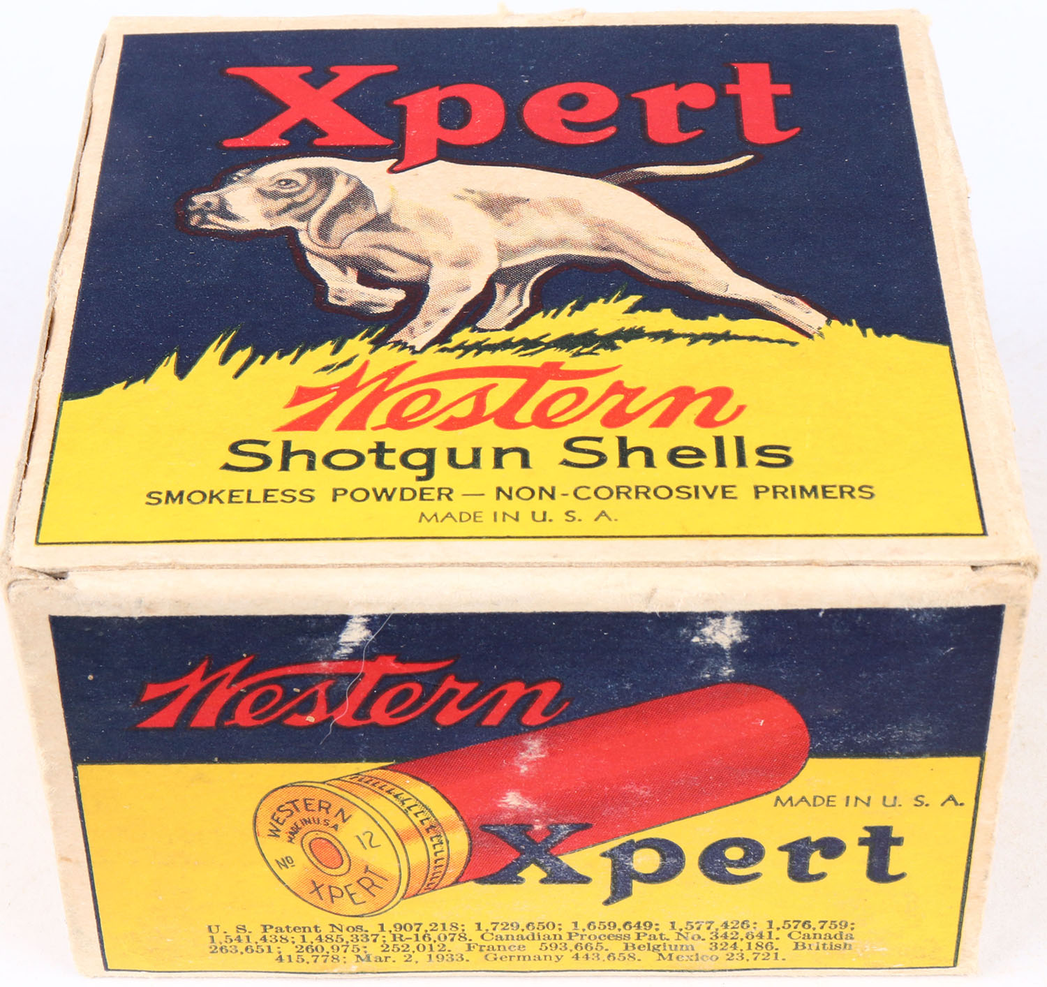 Western Cart. Co., Xpert, 12ga., 1pc., , blue, yellow & red box with a dog on point, Loading: No. 6 Shot, box is solid with excellent colors. Shells are very good. Grade: Excellent + - Value: 20 to 60