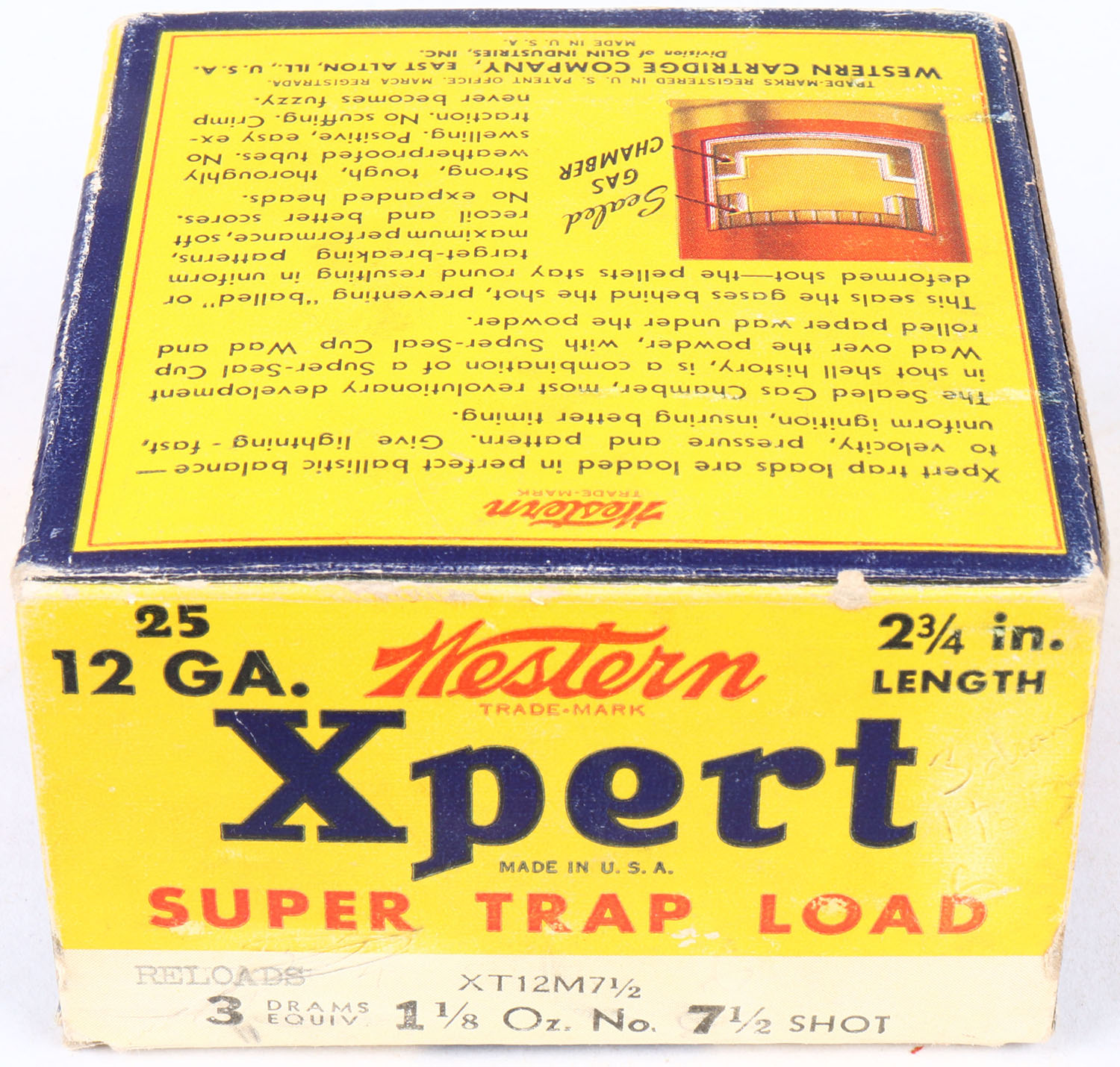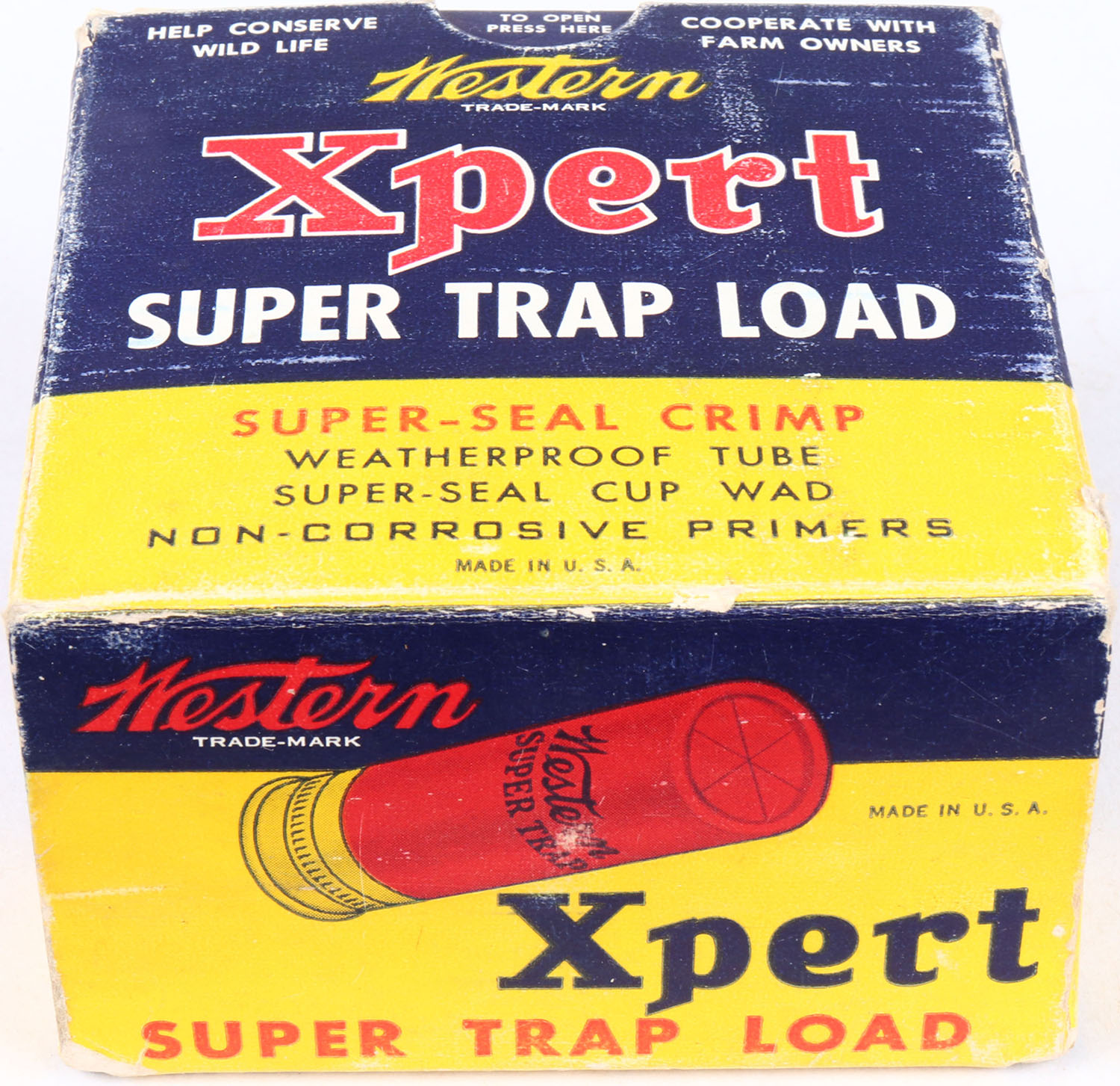 Western, Xpert Super Trap Load, 12ga., 2 3/4'', 1pc., Full of all incorrect shells, shot size 7 1/2, yellow, blue & red box, box is very solid with light soiling, and very nice colors, shells are fair. Grade: Excellent - Value: 10 to 30
