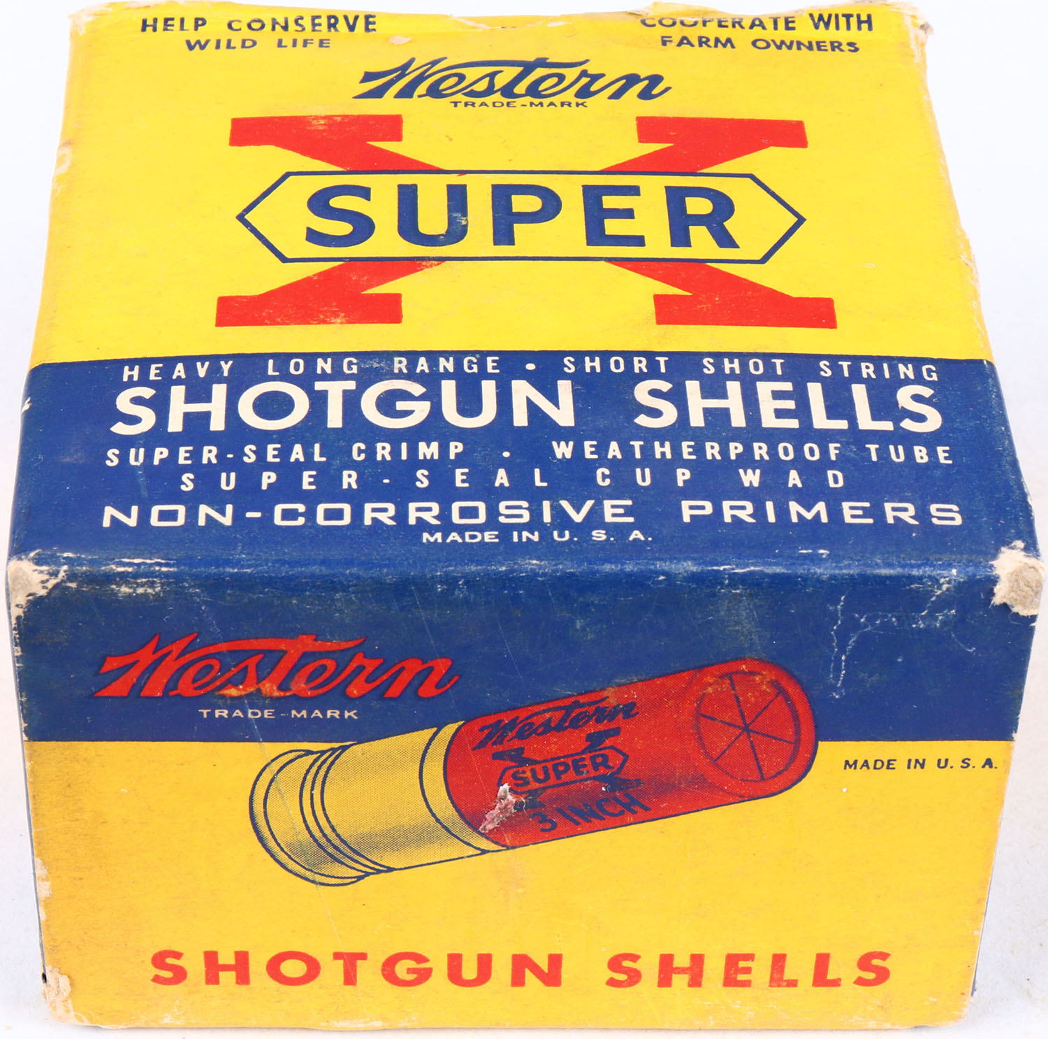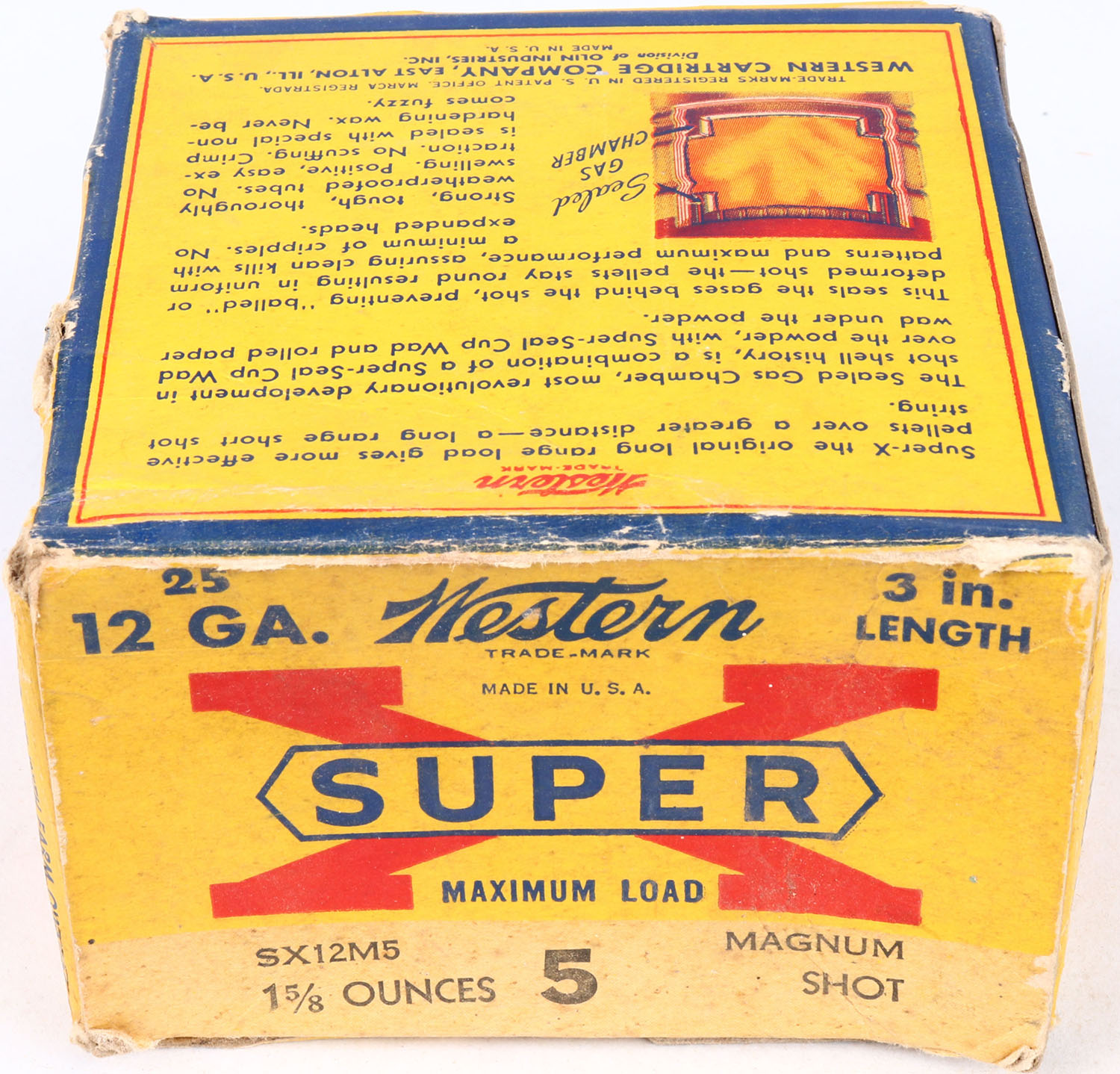 Western, Super X, 12ga., 3'', 1pc., Partial 22rds shot size 5 Magnum, yellow, blue & red box, box is solid with light soiling, shells are excellent. Grade: Excellent + - Value: 10 to 30