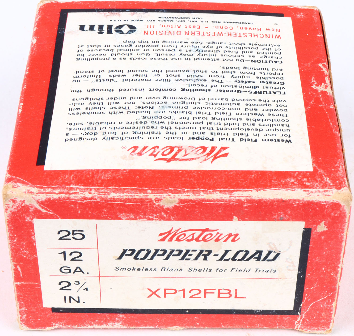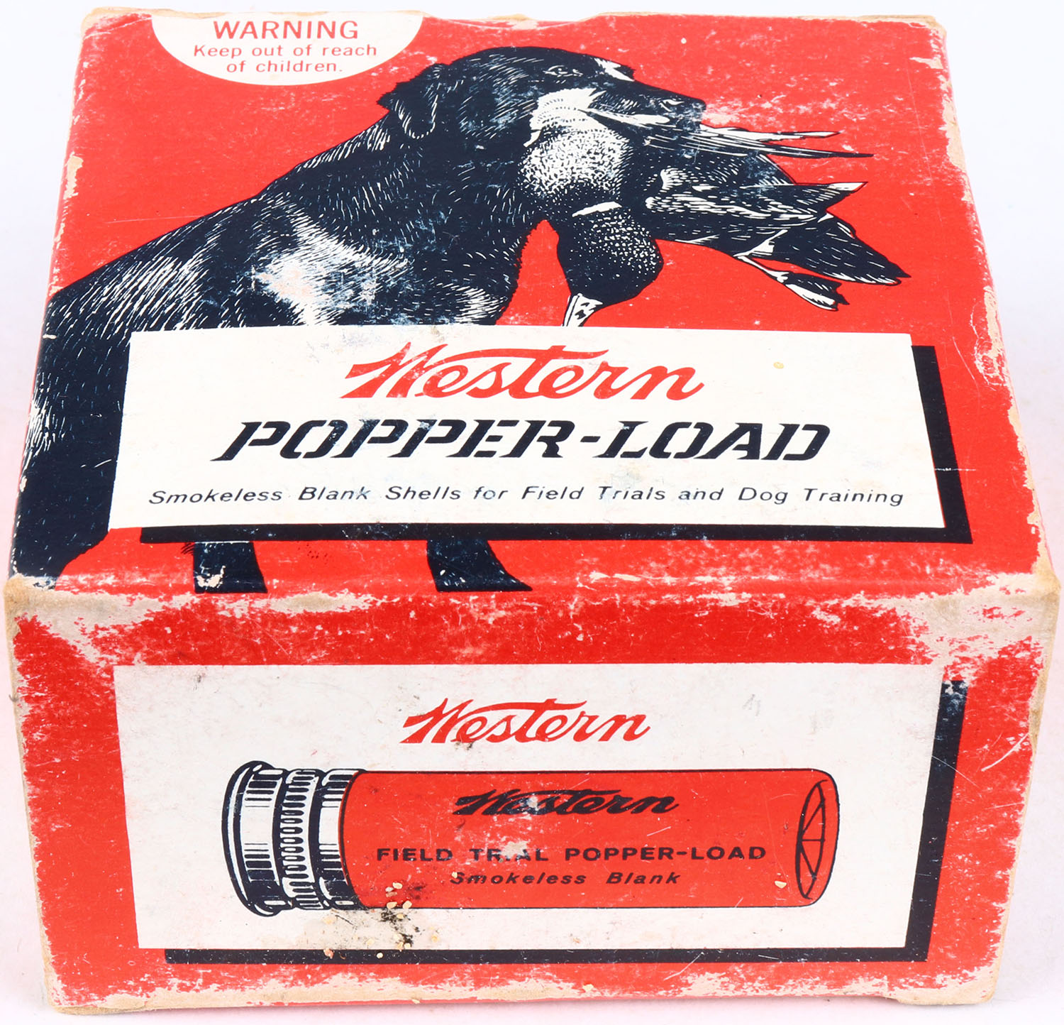 Western, POPPER-LOAD, 12ga., 1pc., Full, red, white & blue box, made for training dogs, very nice box. Grade: Very Good ++ - Value: 10 to 40