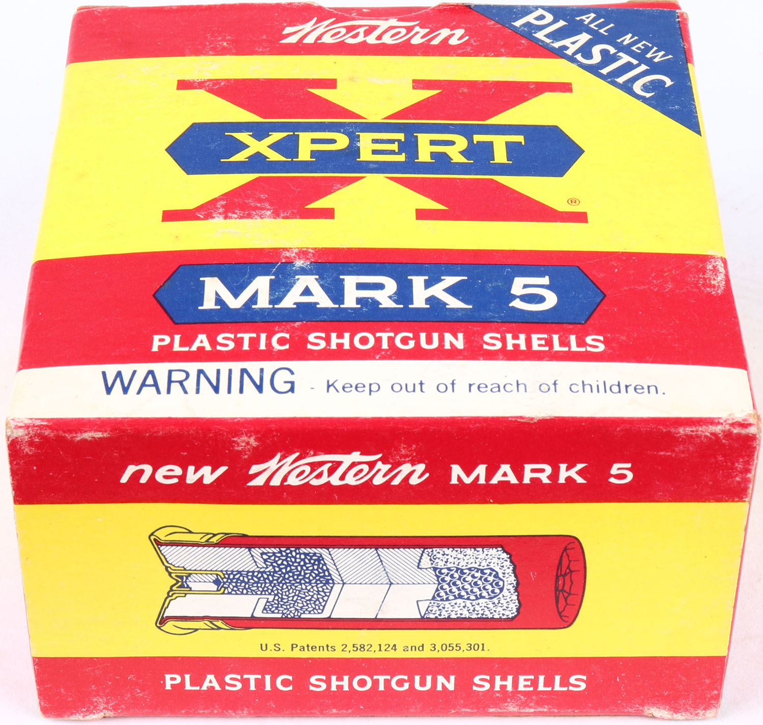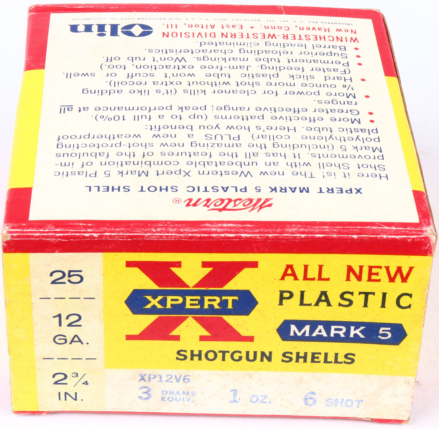 Western, X-pert, Mark 5, 12ga., 2 3/4'', shot size 6 Shot, 1pc., Full, yellow, blue & red box, box is very solid, shells are excellent. Grade: Excellent - Value: 10 to 30