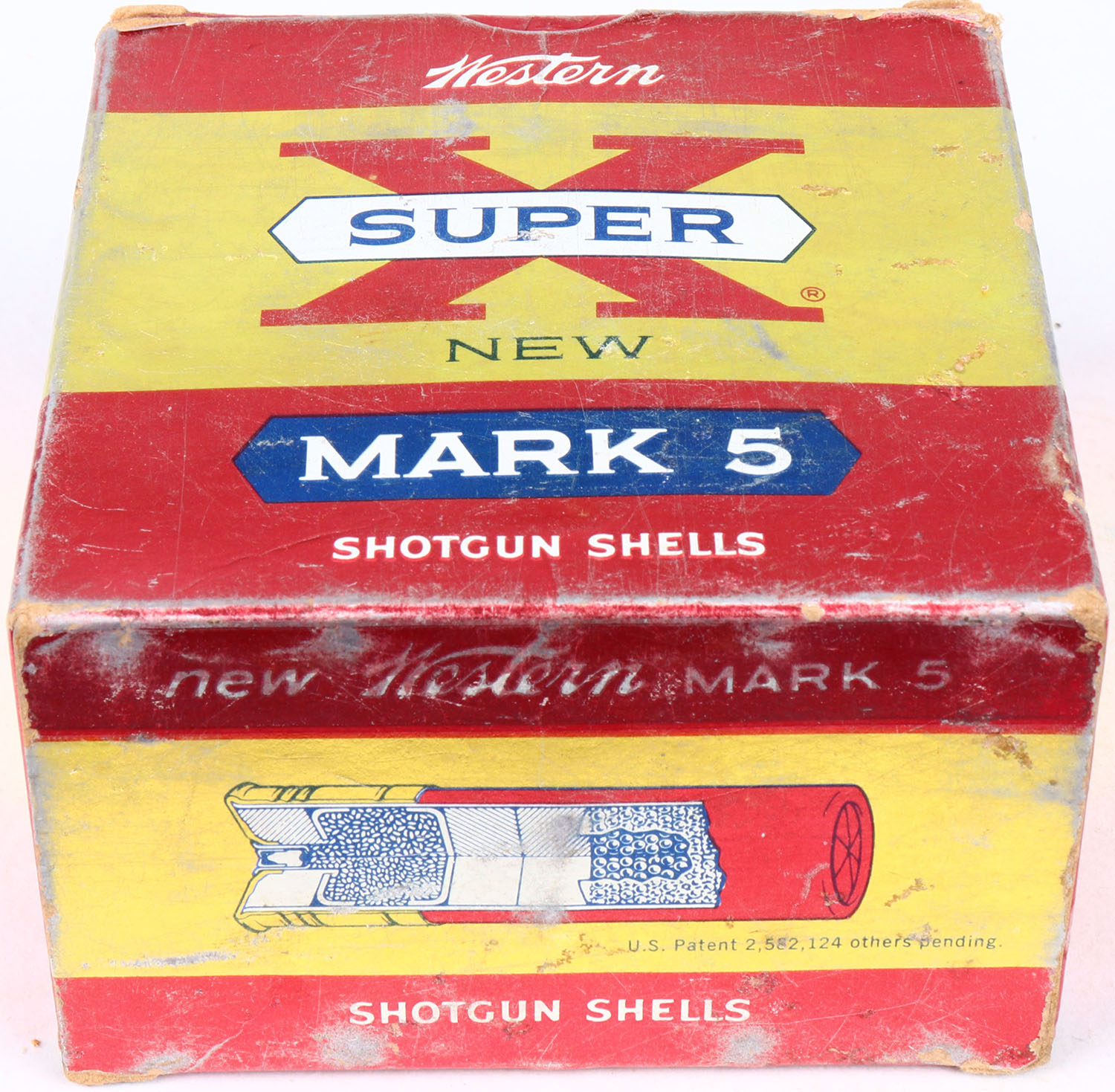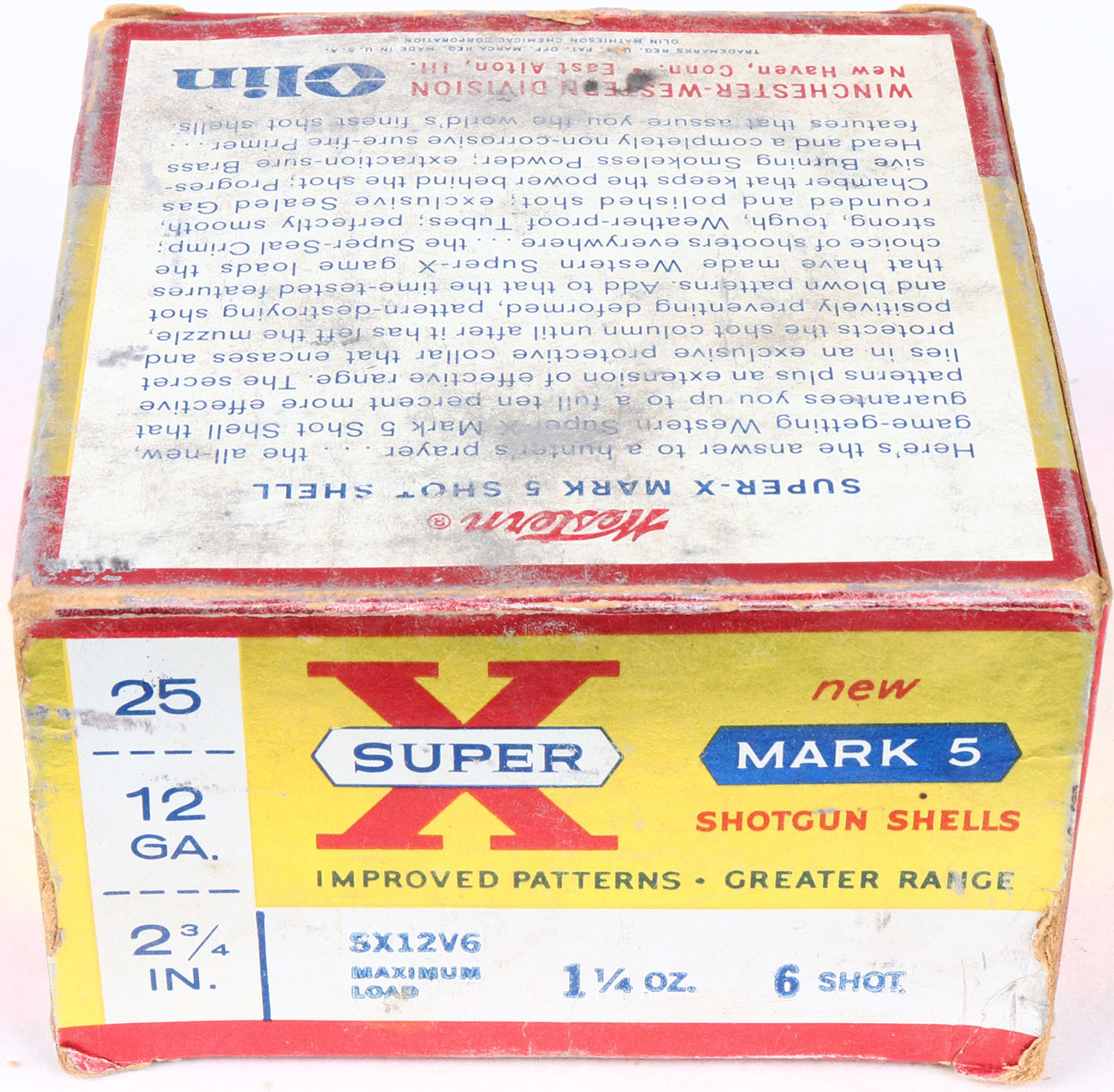 Western, Super-X Mark 5, 12ga., 2 3/4'', 1pc., Partial 19rds, shot size 6, yellow, blue & red box, box is very solid shells are excellent. Grade: Excellent - Value: 10 to 30