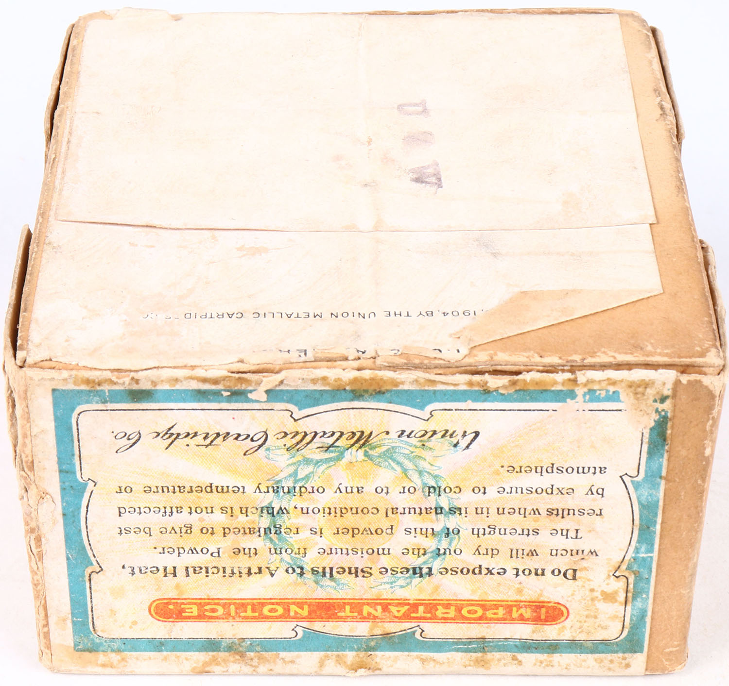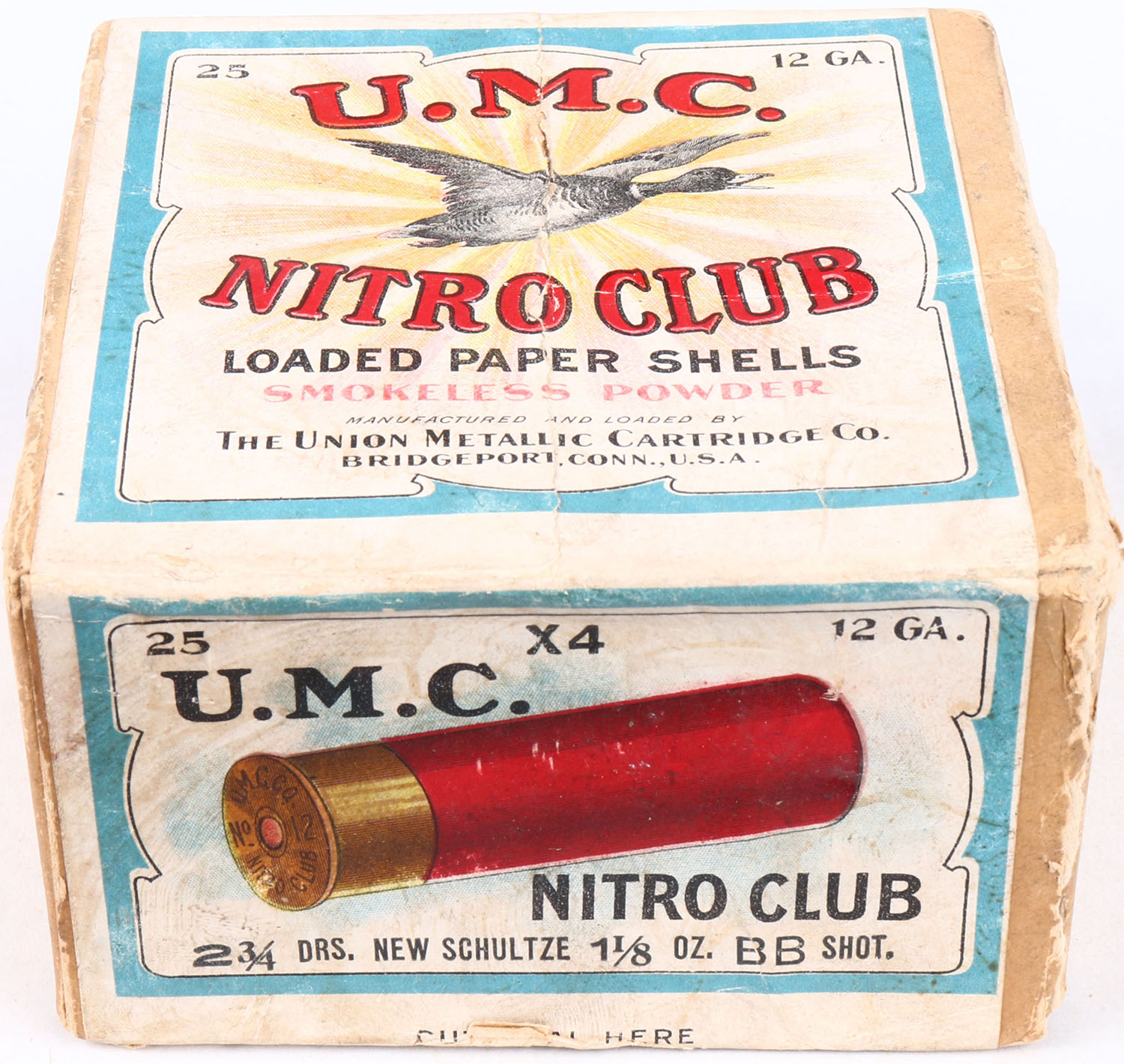 U.M.C. Nitro Club, 12 GAUGE, 2pc., Empty, shot size BB, buff box with sunburst logo & Mallard flying on top, has light soiling, light edge wear, one seam split & puncture to top of box, has great color to label. Grade: Excellent - Value: 50 to 250