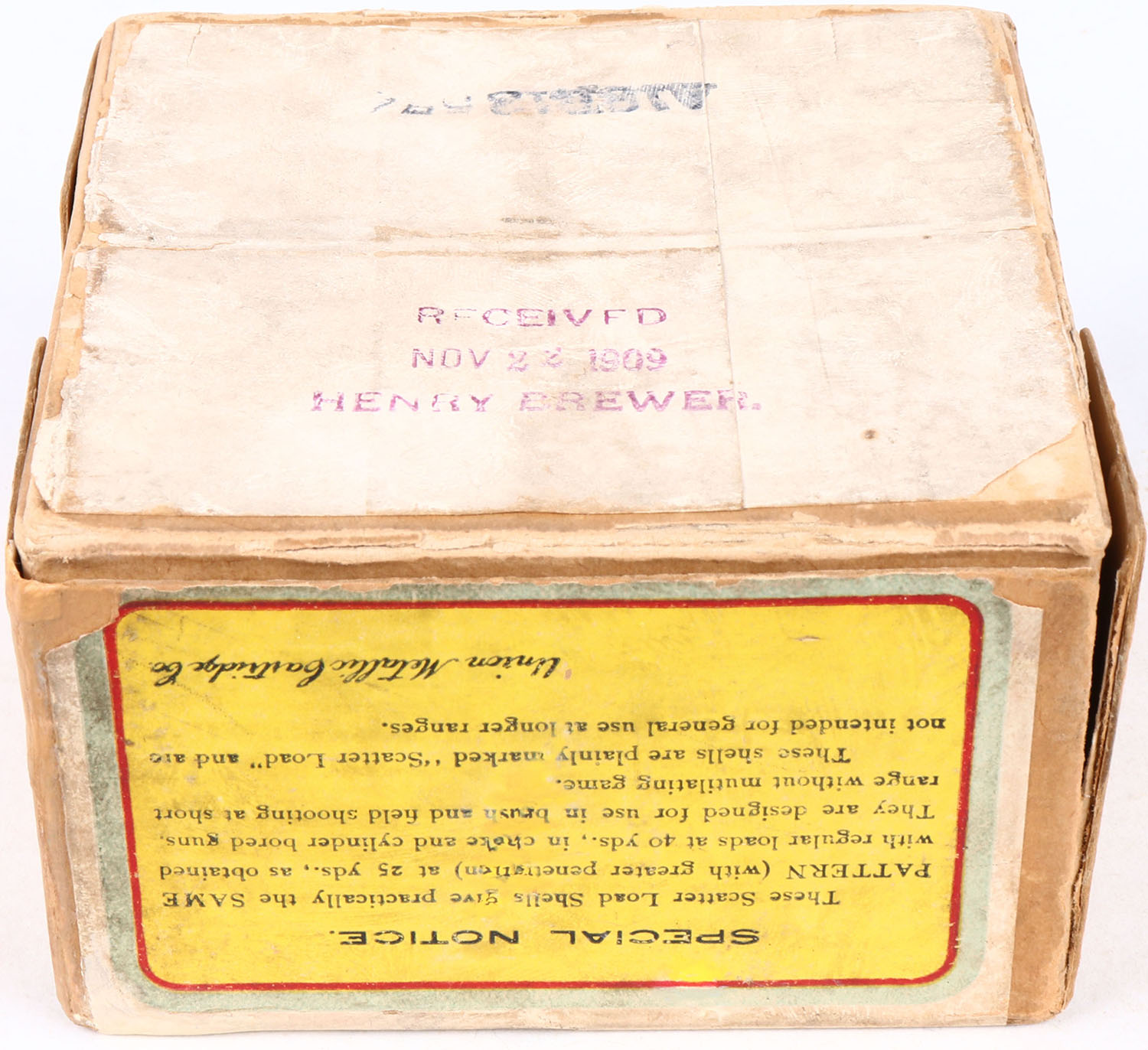 rare UMC, Arrow, 12ga, Scatter Load, 2pc., Empty, No. 9 Shot, buff box with red, yellow, & white paper label, box has been professionally touched up, has seam split & great colors to label. Grade: Excellent - Value: 70 to 350