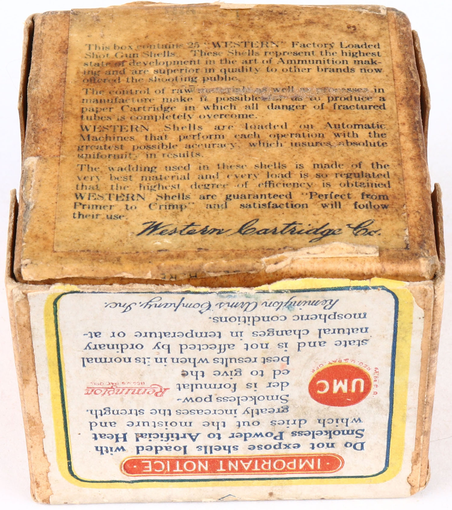 Remington UMC, SHOT GUN CARTRIDGES, 410ga., 2pc., Partial 1rd, shot size ?, 2'', Buff box with yellow, white & red paper label, label is 72% intact, box has incorrect bottom, seam split with age soiling and nice colors, shell is very good. Grade: Very Good + - Value: 30 to 200