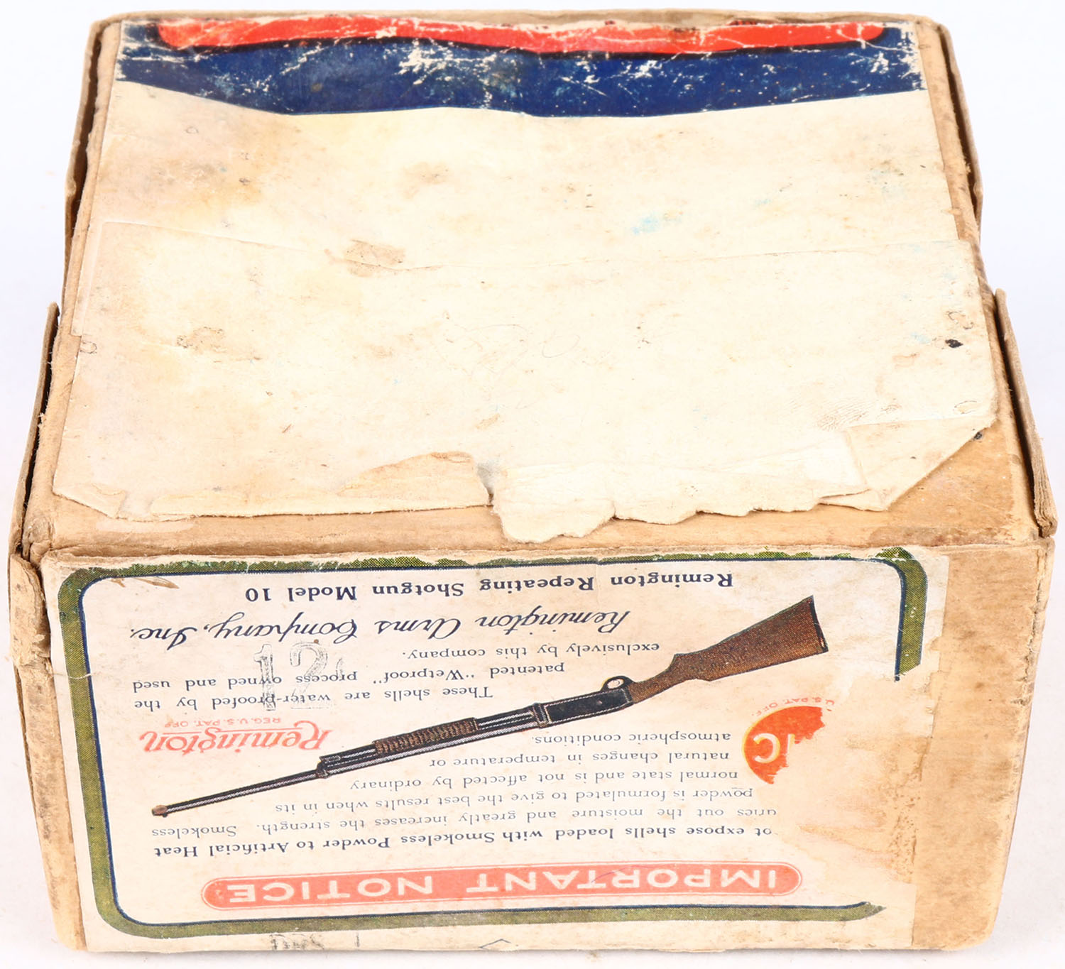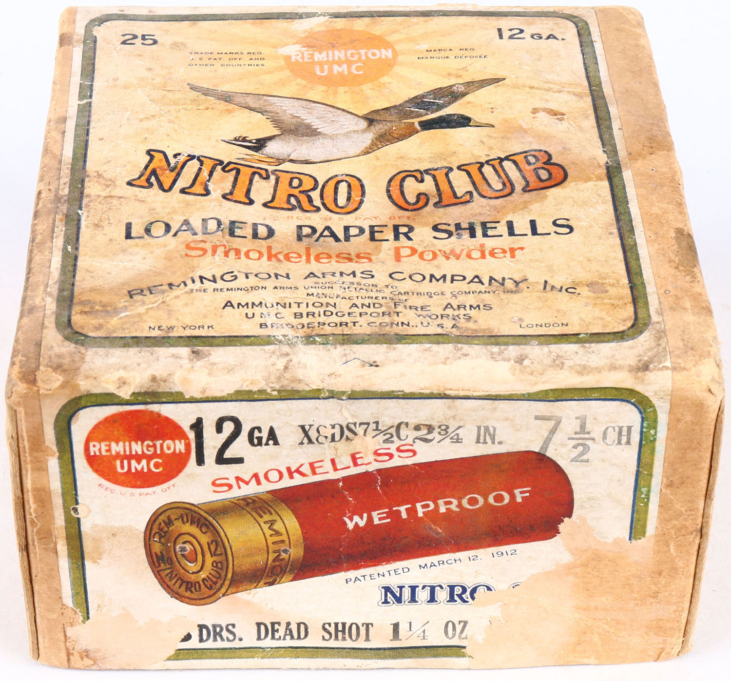 REM U.M.C. Nitro Club, 12 GAUGE, 2pc., Empty, shot size 7 1/2 CH, buff box with sunburst logo & Mallard flying on top, has nice color to label, box has small seam split, light edge wear with age soiling, has incorrect bottom. Grade: Very Good ++ - Value: 20 to 150