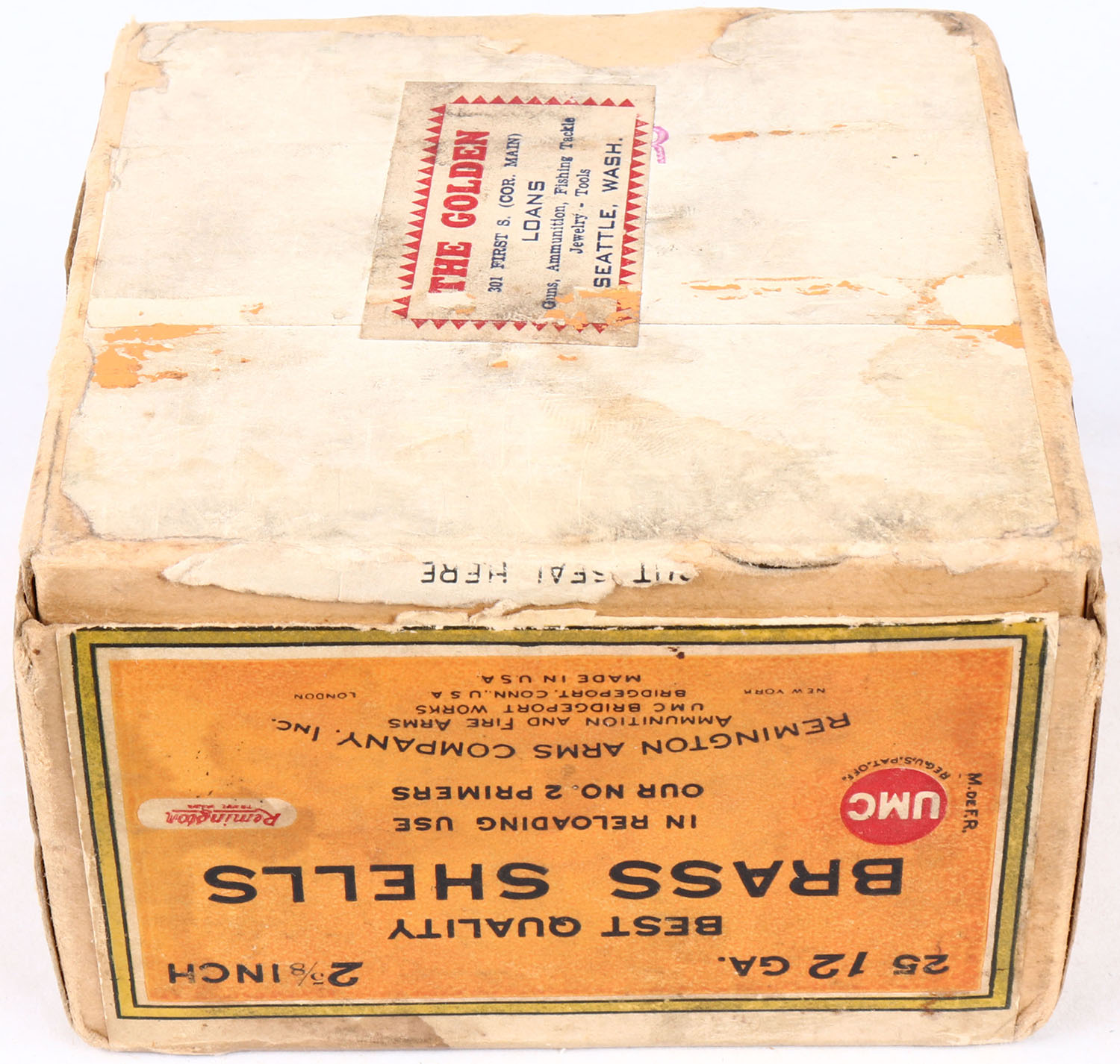 Remington UMC, Best Quality Brass Shells, 12ga., 2pc., Empty, 2 5/8'', buff box with buff, yellow, orange & black label, box is very solid with soiling, shells are very good. Grade: Excellent - Value: 50 to 200