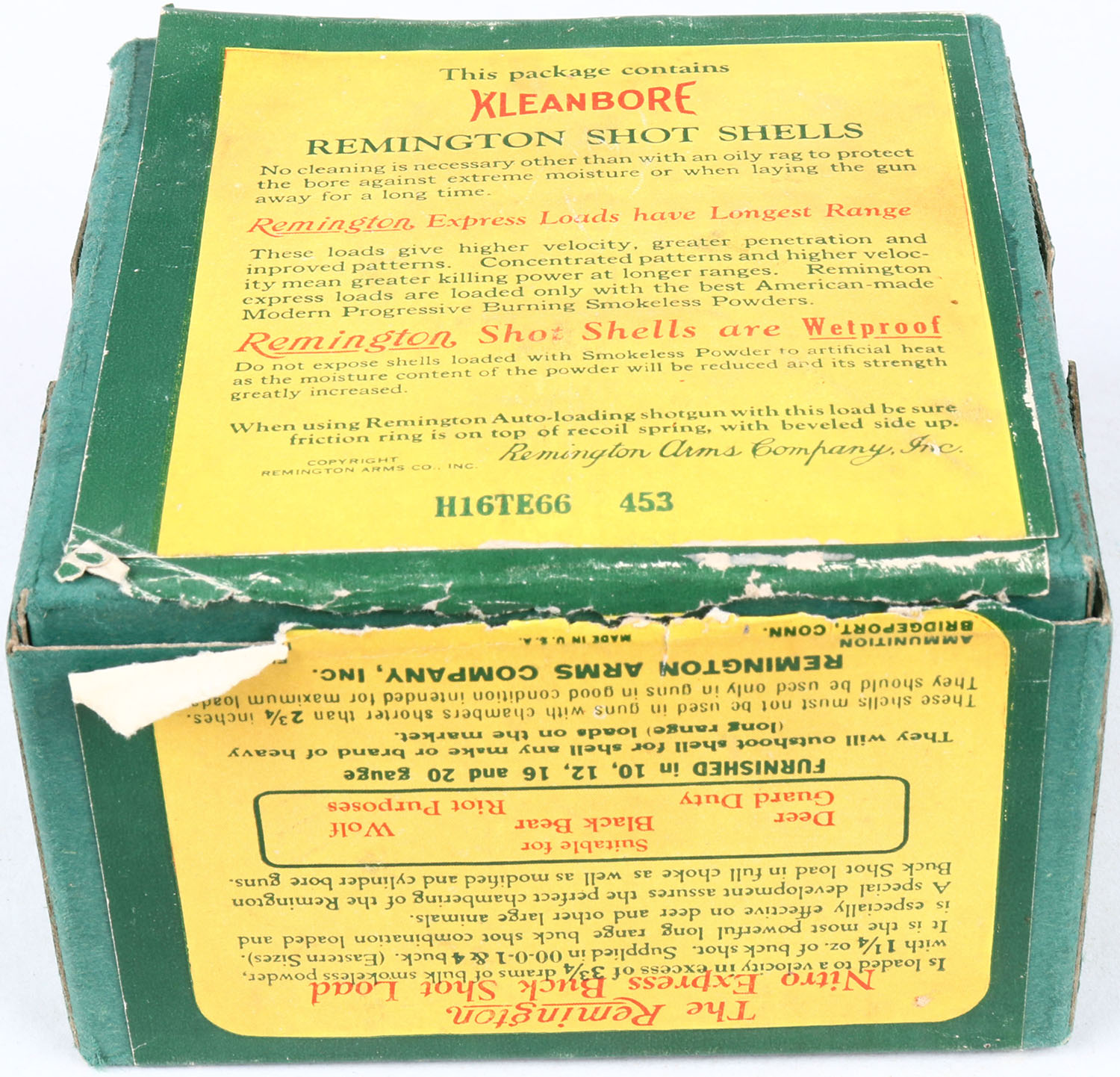 Remington Nitro Express, Long Range Game Loads, pictures Buck jumping, 12ga., 2pc., Partial 18rds., shot size 0 BUCK, green box with sunburst logo & BUCK on side, box is very solid with light soiling, shells are excellent. Grade: Excellent - Value: 50 to 250